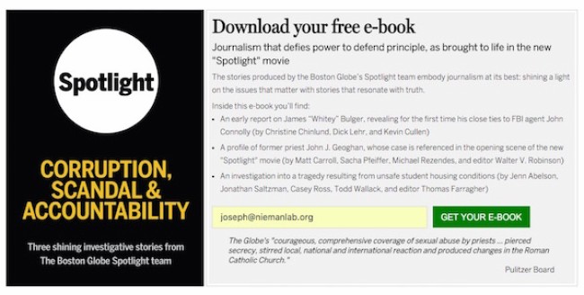 Der Globe hat Werbung für das E-Book von Spotlight auf seiner Homepage und bestimmten Zielseiten geschaltet, die er angelegt hat, um seine Berichterstattung zum Film und den investigativen Artikeln unterzubringen.
