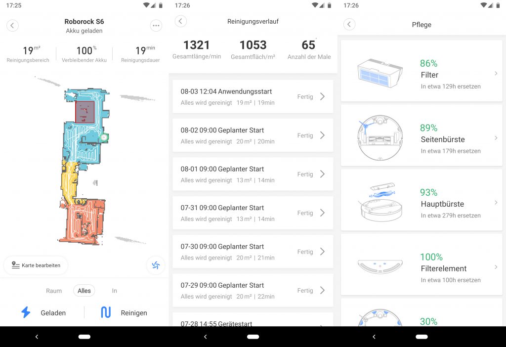 Mobil-Enthusiasten finden sich in der Mobil-Anwendung allerdings schnell zurecht. Außerdem bietet sie das ein oder andere Zusatzfeature. Los geht’s mit der taggenauen Programmierung. Der Sauger kann für bestimmte Wochentage aktiviert werden. Da sich das Gerät den gefahrenen Raum merkt und in der Anwendung hinterlegt, lassen sich Bereiche selektiv aus- oder abwählen. In der Küche fällt mehr Dreck an an? Kein Problem der Roborock S6 kann dort täglich seine Bahnen drehen.
