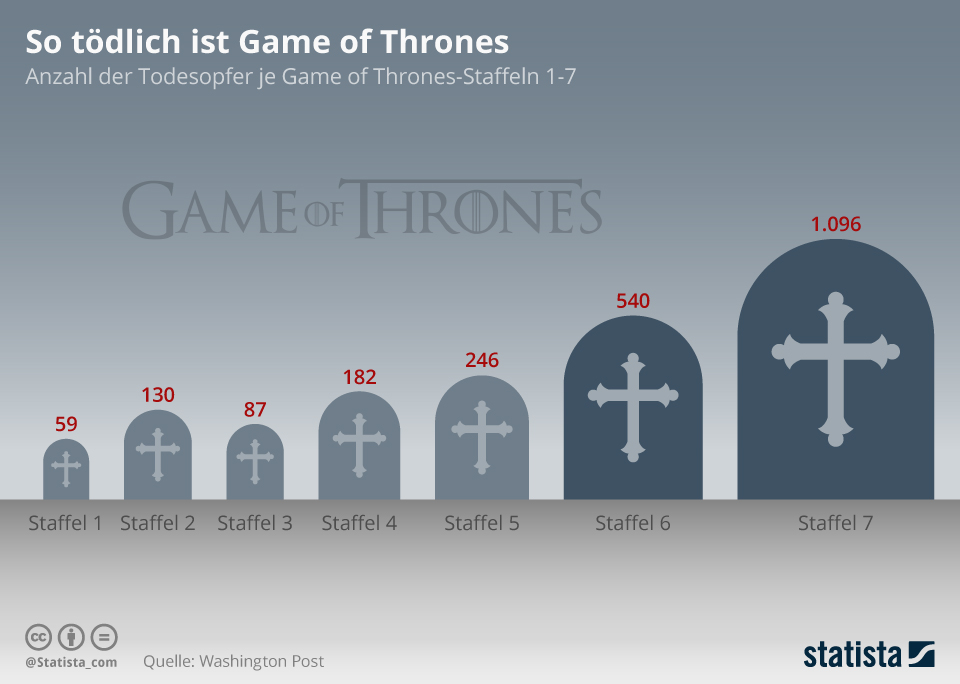 Die Grafik, auf die wir uns in diesem Artikel hauptsächlich beziehen wurde von der Washington Post veröffentlicht. Die Autoren haben sich die Mühe gemacht wirklich jeden Tod zusammenzutragen und wunderschön anschaulich illustriert darzustellen, weswegen wir hier noch mal auf das Original verlinken möchten. Dort findet ihr auch noch einmal genauere Informationen woran und aus welchem Grund die jeweiligen Charaktere dahingeschieden sind.