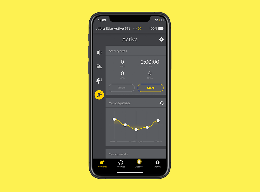 Wie bei Jabra üblich entfalten die Elite Active 65t allerdings erst mit der Companion App ihre volle Funktionsfähigkeit. Persönliche Musikeinstellungen lassen sich etwa per Equalizer konfigurieren. Der Hersteller bietet verschiedene Audio-Profile für Büro, Bahn und Fitness. Unter Soundscape lässt sich eine gleichmäßige Soundkulisse generieren. Außerdem gibt’s einen abgespeckten Sportmodus: Die integrierten Bewegungssensoren helfen beim Tracken der persönlichen Lauf-Leistung. Leider fehlt eine Pulsmessung.