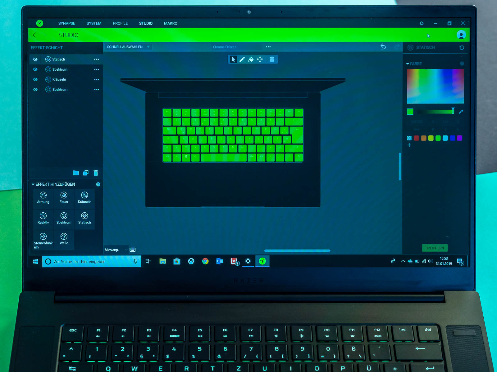 Im Chroma-Bereich der Synapse-Software lassen sich sogar individuelle Farbverlaufseffekte gestalten. Sie lassen sich im Unterschied zu den Advanced-Modellen jedoch nicht jeder Taste einzeln zuordnen, sondern nur dem Keyboard als Ganzes. Stylisch sieht das trotzdem aus.