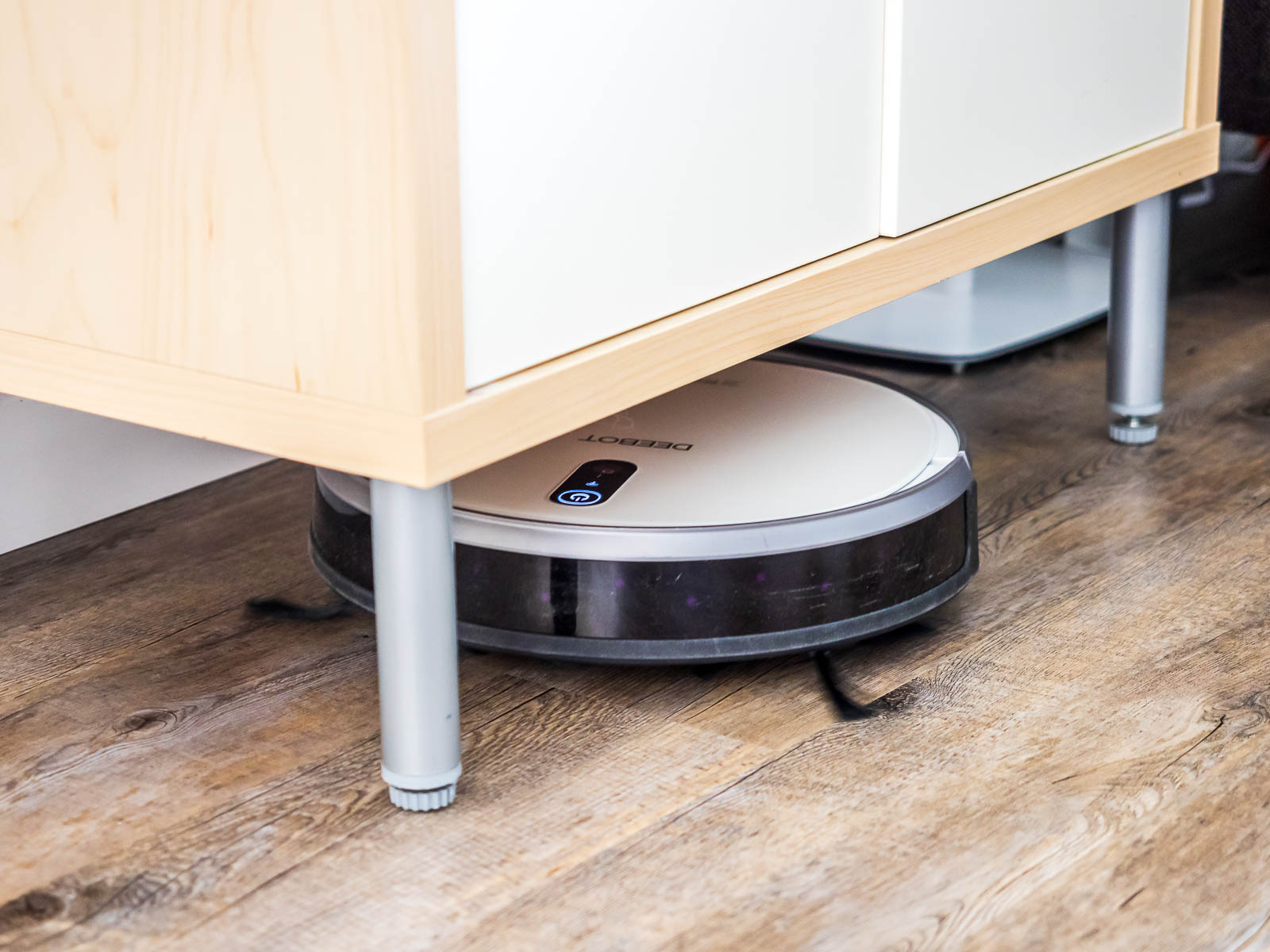 Weil der Staubsaugerroboter mit 8,1 Zentimetern vergleichsweise niedrig und mit 32,5 Durchmessern ausreichend klein ist, manövriert er sich sehr wendig durch den Testhaushalt. Unter Tischen, Sofas und Schränken reinigt er auf diese Weise sogar dort, wo die händische Saugroutine sich aus Bequemlichkeit oft zurückhält.