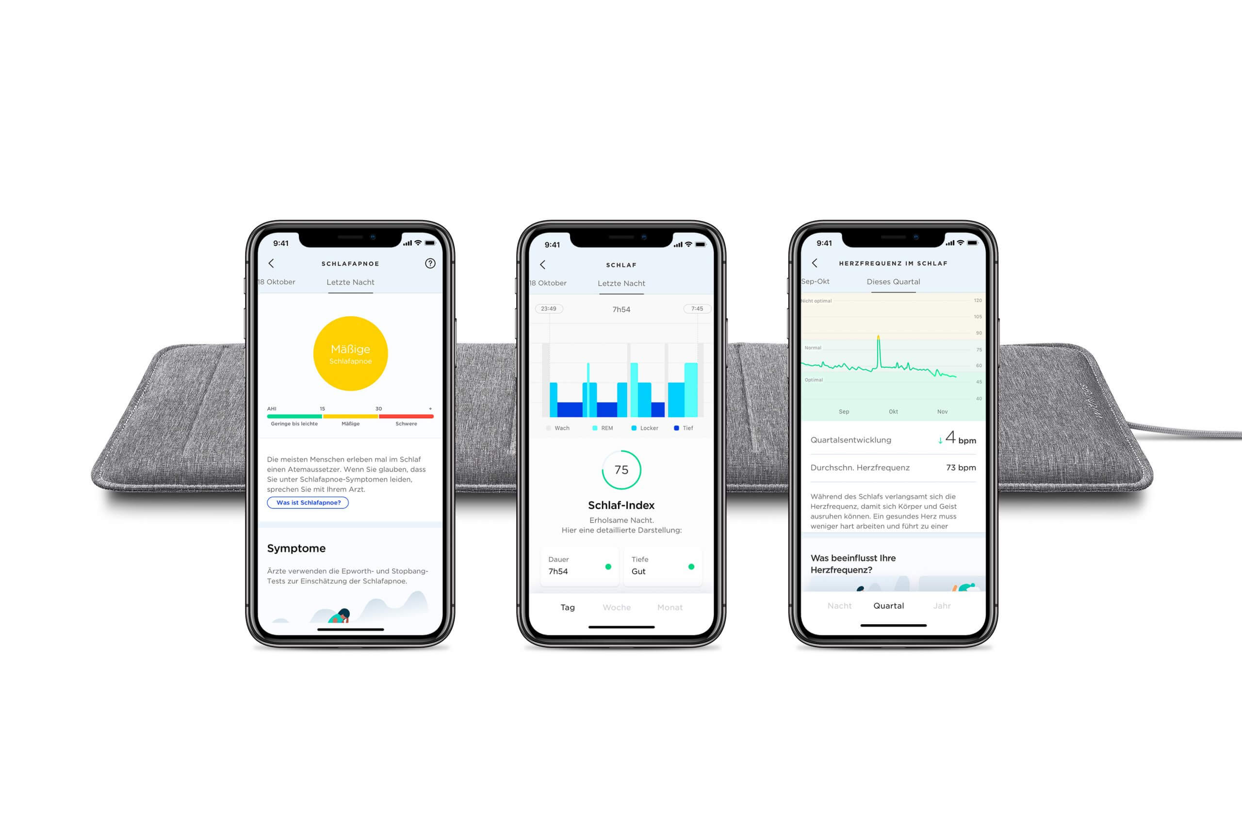 Dazu stecken im fünf Millimeter dicken Textilbezug zwei Sensoren. Zum einen ein pneumatischer Sensor, der die Atemfrequenz, die Herzschläge und die Körperbewegungen registriert. Zum anderen ein Geräuschsensor, der Audiosignale identifiziert, die ganz typisch fürs Schnarchen und für Schlafapnoe sind. Zwar konnte die seit 2018 erhältliche Vorgängermatte nach einem Firmware-Update im März 2019 bereits ebenfalls Atemaussetzer ermitteln – aber offenbar nicht in einer diagnostischen Qualität, die für ein Prüfsiegel reichte.