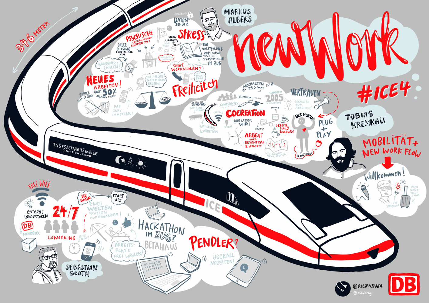 Für meinen Opa erscheint meine Art zu arbeiten, nur mit einem Laptop im Zug sitzend ständig herumzufahren, immer noch nicht ganz real. Inzwischen arbeiten aber bereits rund die Hälfte der deutschen Arbeitnehmer mobil, wie der freie Autor Markus Albers auf dem „New Work Train“-Event der Deutschen Bahn Anfang September erklärte. Mit dem eigenen Smartphone, so Albers, habe man ja all das, was früher ein Büro ausmachte, inzwischen stets mit sich. Passenderweise fand diese Veranstaltung in einem von Hamburg nach Kassel fahrenden ICE 4 statt.
