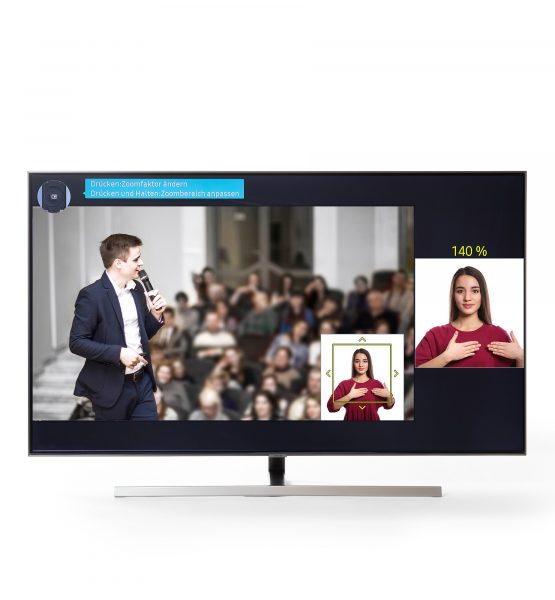 Für Menschen mit Hörbehinderung haben wir den Gebärdensprache-Zoom integriert. In einigen Livesendungen wird gesprochener Text zwar von einem Dolmetscher in Gebärdensprache übersetzt, doch dieser ist oft nur in einem kleinen Bildausschnitt zu sehen. Mit dem Zoom können Nutzer diesen Bildbereich bei Bedarf einfach vergrößern.