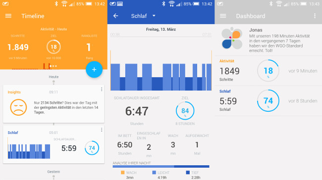 Am Ende des Tages muss die Uhr keinesfalls abgelegt werden, denn neben den eigenen Bewegungs- analysiert sie auch die Schlafaktivitäten. Minutiös zeichnet der Tracker die einzelnen Schlafphasen auf und informiert über die entsprechende Dauer. In der App kann für den nächsten Morgen ein Wecker gestellt werden, der durch leichte Vibrationen den Träger aus dem Schlaf holt. Das geschieht jedoch nach einer festgelegten Zeit und nicht nach Schlafphasen. Ob die Uhr die Weckzeit verinnerlicht hat, kann durch einen Fingertipp auf das Mineralglas überprüft werden. Dann zeigen die Analogzeiger kurzzeitig die programmierte Zeit an.