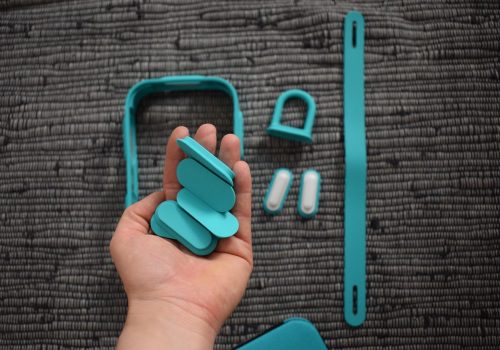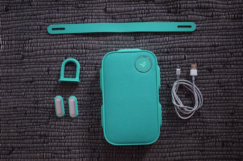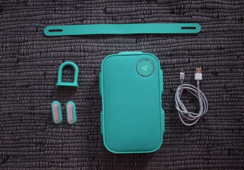 Innerhalb des Rahmens befinden sich an fünf strategischen Stellen austauschbare Bits, die man durch einen einzelnen kürzeren Henkel mit verschließbarer Funktion oder Ösen mit Aufhängevorrichtung ersetzen kann, durch die eine längere Schlaufe passt. Alle Teile sind aus farbigem Silikon, allerdings wirken die Extrabits bei aller Hochwertigkeit der Box selbst etwas billig – insbesondere die Schlaufe rutscht gern mal aus der Öse, da sie aus recht dünnem Gummi besteht. Hier wäre ein höherwertiges Material wie Leder oder wenigstens eine Stoffummantelung angebracht gewesen, wie sie Libratone bereits beim Aufladekabel mitliefert. In der Silikon-Ausführung wirkt das Ganze leider ein wenig wie eine Abwandlung einer Duschgelflasche mit Einhänge-Halterung.