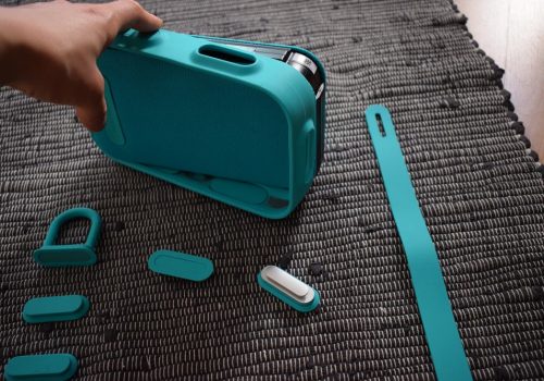 Der Libratone One Click zeichnet sich trotz des schlichten Designs durch seine Vielseitigkeit aus. Den Silikonrahmen des Outdoor-Lautsprechers kann man abnehmen und die einzelnen Elemente austauschen. Hierfür benötigt man etwas Geschick, denn der dicke Rahmen sitzt recht fest auf dem Korpus. Angst, etwas kaputtzumachen, muss man allerdings nicht haben, denn auch hinter der Verschalung ist der Speaker robust konzipiert.