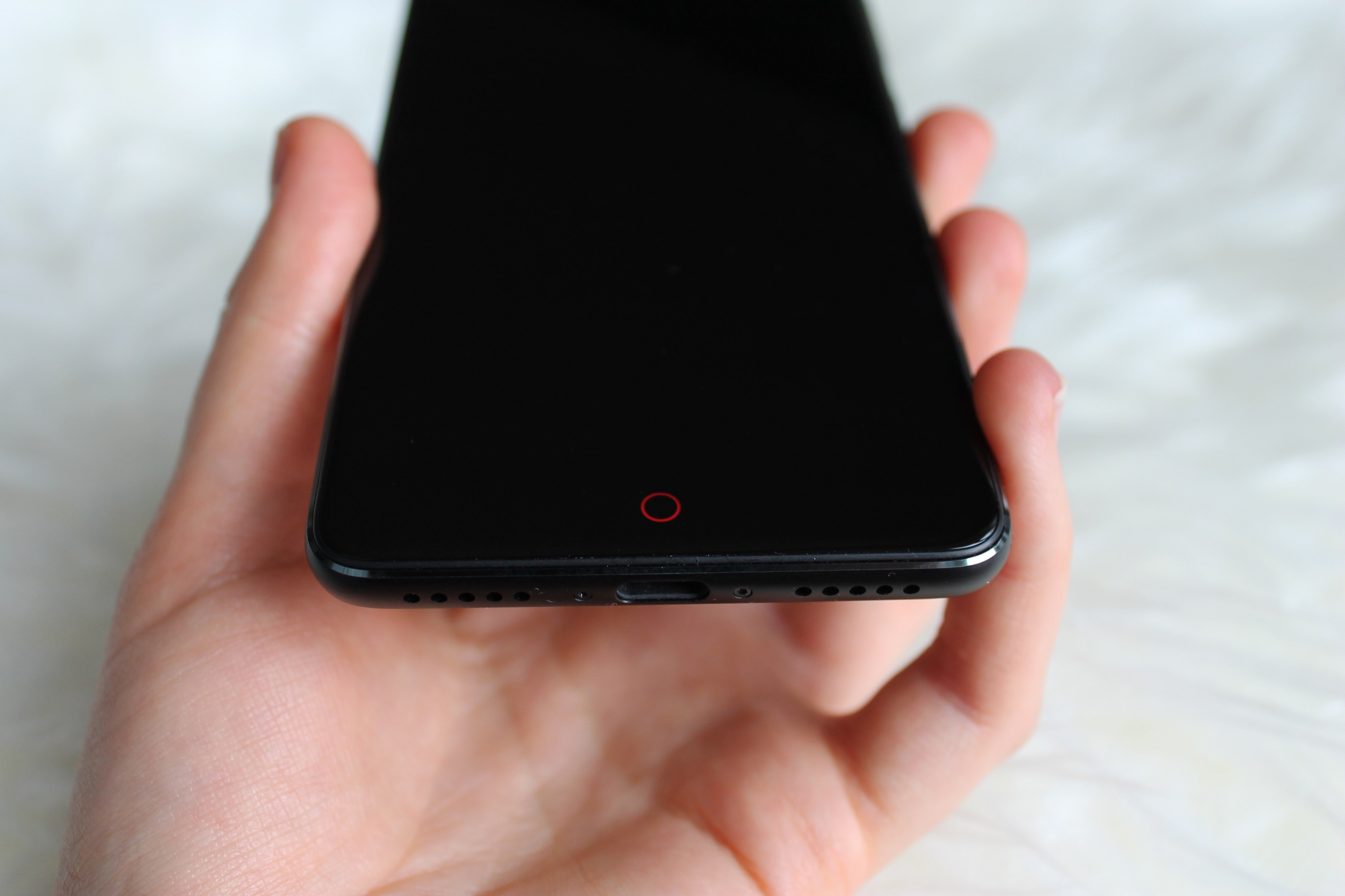 Der 3,5 mm-Klinken-Eingang ist am oberen Rand angebracht, was ich persönlich gewöhnungsbedürftig finde. Am unteren Rand befinden sich jeweils der USB Typ-C Port Ausgang sowie Lautsprecher und Mikrofon. An dieser Stelle wurde bei dem Mittelklasse-Modell gespart. Die Lautsprecher sind zwar laut genug für ein Smartphone, jedoch lässt der Sound sehr zu wünschen übrig. Die Musik klingt insgesamt sehr blechern und lieblos „herausgequetscht“. Zudem ist es zunächst irritierend, dass der Ausgang des Mikrofons aussieht, wie ein weiterer Lautsprecher. Das macht das Erscheinungsbild zwar symmetrisch und harmonisch, beim Sound-Test kommt dann aber die Ernüchterung. Für einen kurzen Moment (vor dem Blick ins Handbuch) habe ich sogar geglaubt, ein Lautsprecher sei kaputt.