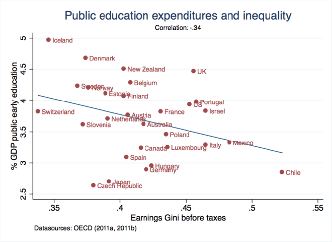 Wenn ein Staat keine öffentlichen Bildungsmöglichkeiten anbietet, sind die Möglichkeiten zur Bildung für ein Kind ausschließlich von den Ausgaben der Eltern abhängig. Im Gegensatz dazu kann der Zugang zu öffentlicher Bildung den Spielraum zwischen Reich und Arm angleichen. Das Ganze nennt man redistributive Aufwendungen.