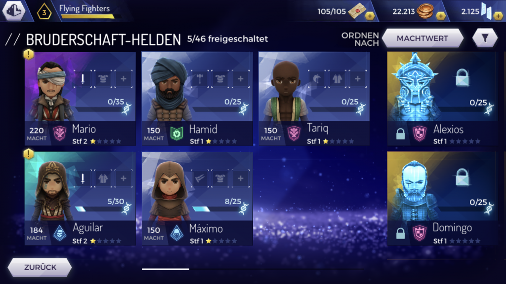 Worauf sich viele Fans der Assassin’s Creed Reihe freuen, seit das Mobile Game angekündigt wurde, ist die Vielfalt an Helden aus den anderen Assassin’s Creed Teilen, die man nun gebündelt in der App spielen kann. Insgesamt 46 Helden gibt es. Freigeschaltet werden sie entweder durch Missionen, Stufenaufstiege oder eben DNA-Fragementen, die ihr ebenfalls durch bestimmte Aufgaben bekommt. Jeder Held hat seine eigene Klasse, seine eigenen Special-Angriffe und kann auf individuelle Weise weiter ausgebildet werden. Mit Stufenaufstiegen werden weitere Fähigkeiten freigeschaltet. Das erhöht die Abwechslung im Spiel noch einmal deutlich.