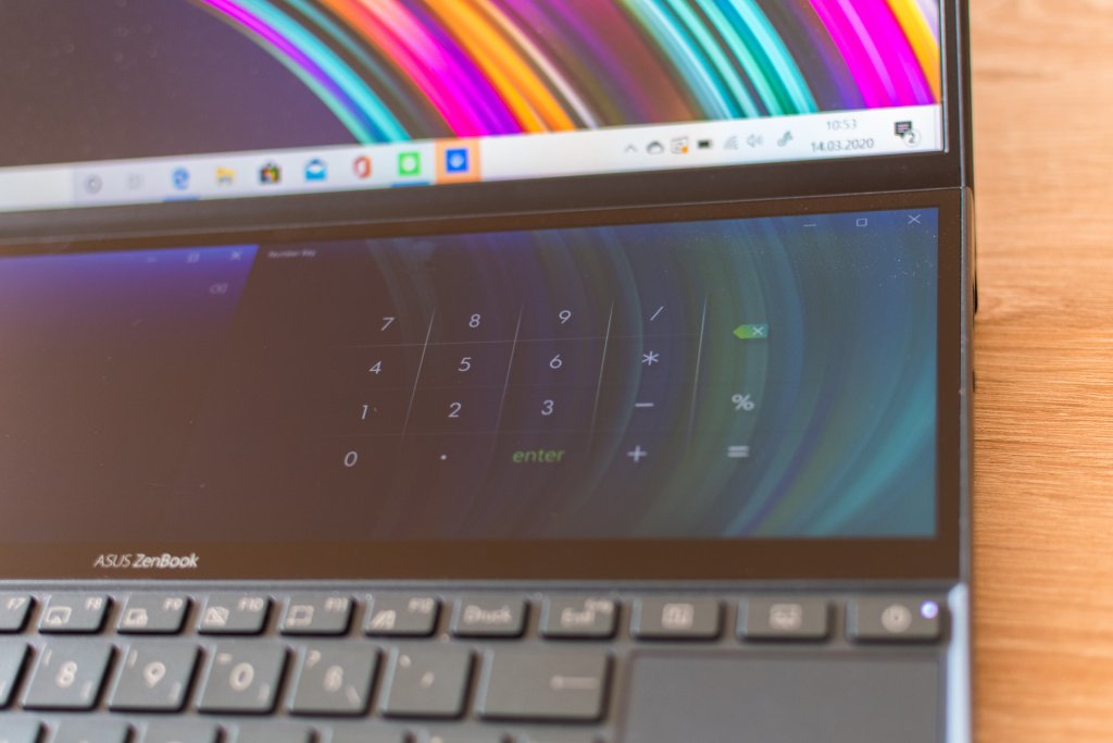 Das eigentliche Highlight des Asus ZenBook Duo ist allerdings die verbaute Display-Paarung. Während das 14 Zoll große LED-FullHD-Panel Stand der Technik ist und vor allem Macbook-Nutzer nicht wirklich locken dürfte, sorgt das zweite Exemplar oberhalb der Tastatur für Wow-Effekte. Auf ihm lassen sich zusätzliche Inhalte wie Apps oder auch ein Schriftfeld und Taschenrechner permanent anzeigen, ohne wertvolle Anzeigekapazität auf dem Hauptbildschirm zu verschwenden. Auch Kurzwahl-Buttons lassen sich konfigurieren. Einziger Wermutstropfen: Auflösung und Helligkeit des Zweitbildschirms könnten besser sein.