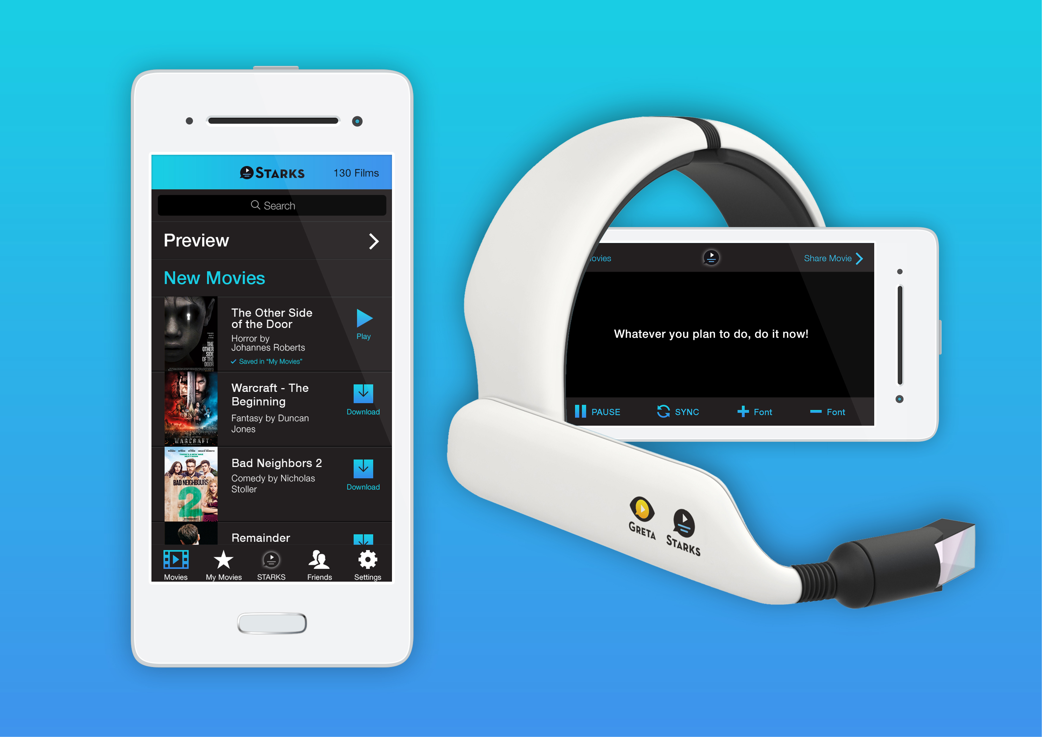 Voraussichtlich im kommenden Sommer will Greta & Starks das inklusive Kinoerlebnis auf die nächste Stufe heben. Dazu hat das Unternehmen ein spezielles Headset entwickelt das vor allem gehörlosen Kinogängern zugute kommt. Durch ein spezielles Sichtfenster werden die Untertitel damit direkt vor der Leinwand erscheinen. So müssen gehörlose Zuschauer nicht mehr zwischen ihrem Smartphone und dem Bildschirm hin und her wechseln, sondern können sich entspannt zurücklehnen.