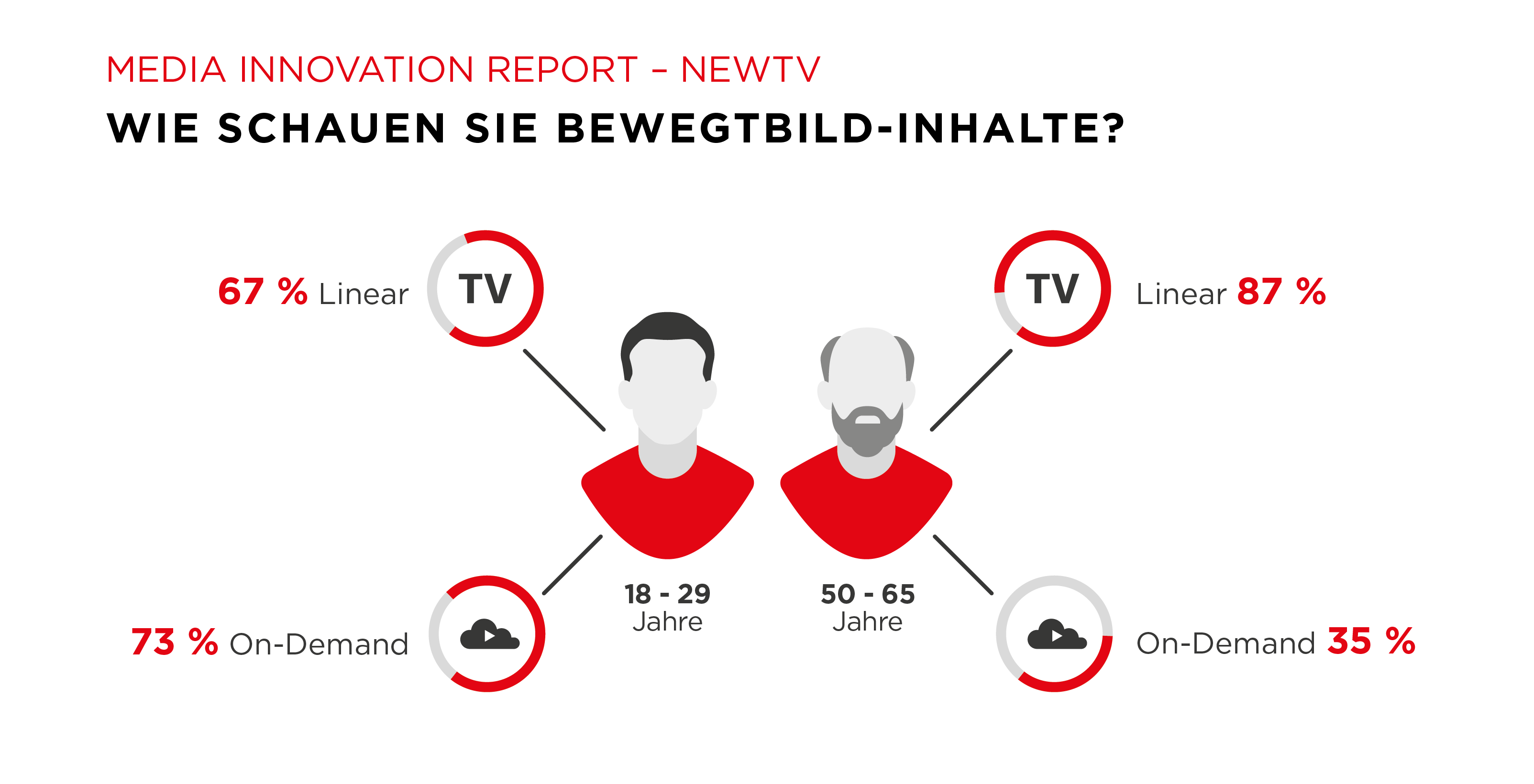 Die ältere Generation schaut noch zu 87 Prozent lineares Fernsehen, also klassische Fernsehformate, die auf ihren Sendern zu festgelegten Zeiten gesendet werden. „Nur“ 35 Prozent dieser Altersgruppe nutzt On-Demand-Inhalte. In der jüngeren Zielgruppe sind es nur noch 67 Prozent, die auf lineares Fernsehen zurückgreifen. On-Demand hat das klassische Fernsehen mit 73 Prozent mittlerweile überholt.
