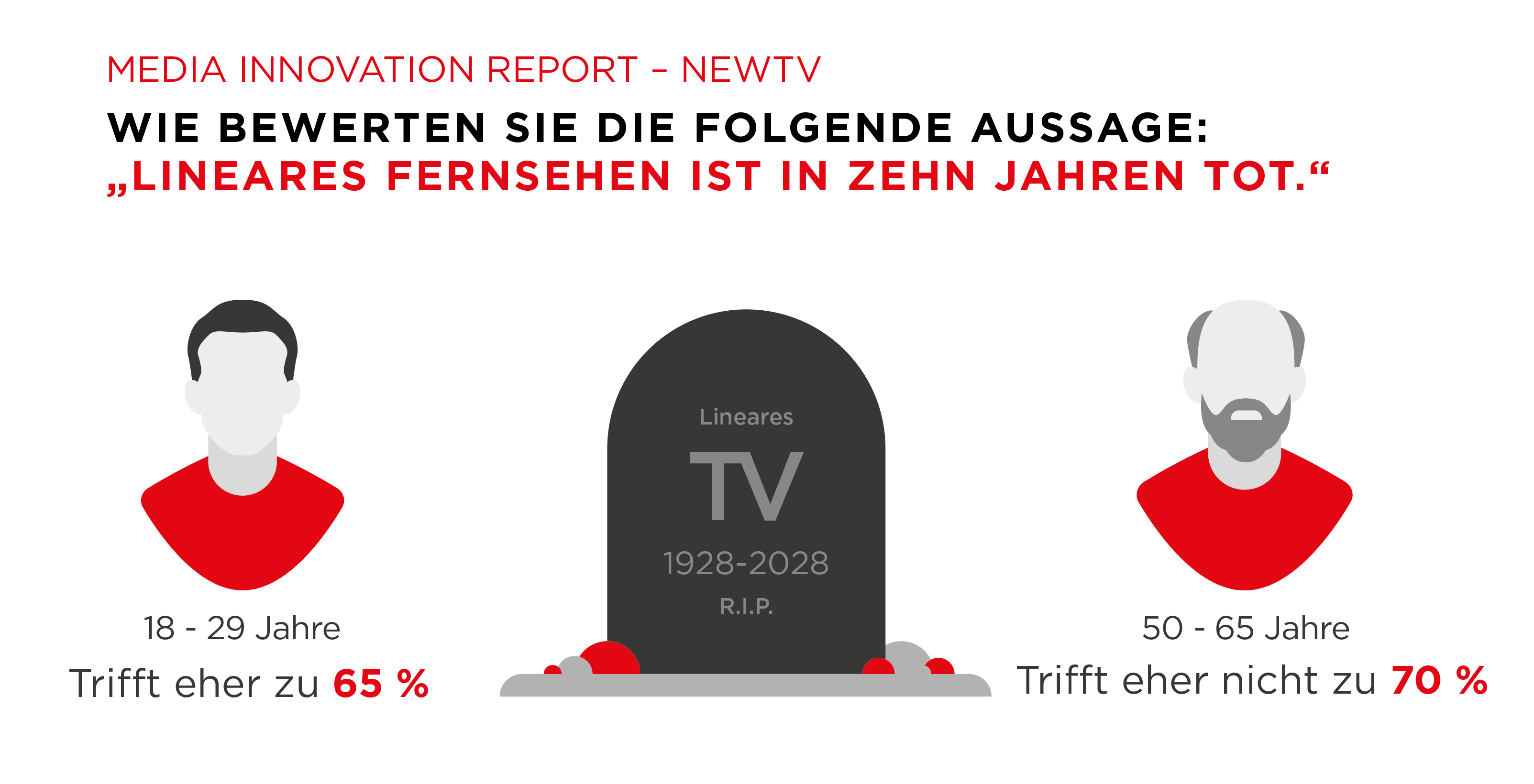 Die 18- bis 29-Jährigen sind sich nur zu 44 Prozent sicher, dass die genannten Formate alle noch in fünf Jahren existieren. Dass das lineare Fernsehen in zehn Jahren tot ist, sehen sie zu 65 Prozent sogar „eher zutreffend“. Bei den 50- bis 65-Jährigen sind hingegen 70 Prozent der Meinung, dass es „eher nicht“ zutrifft. 74 Prozent sind sich außerdem sicher, dass keines der klassischen Formate in fünf Jahren verschwunden ist.