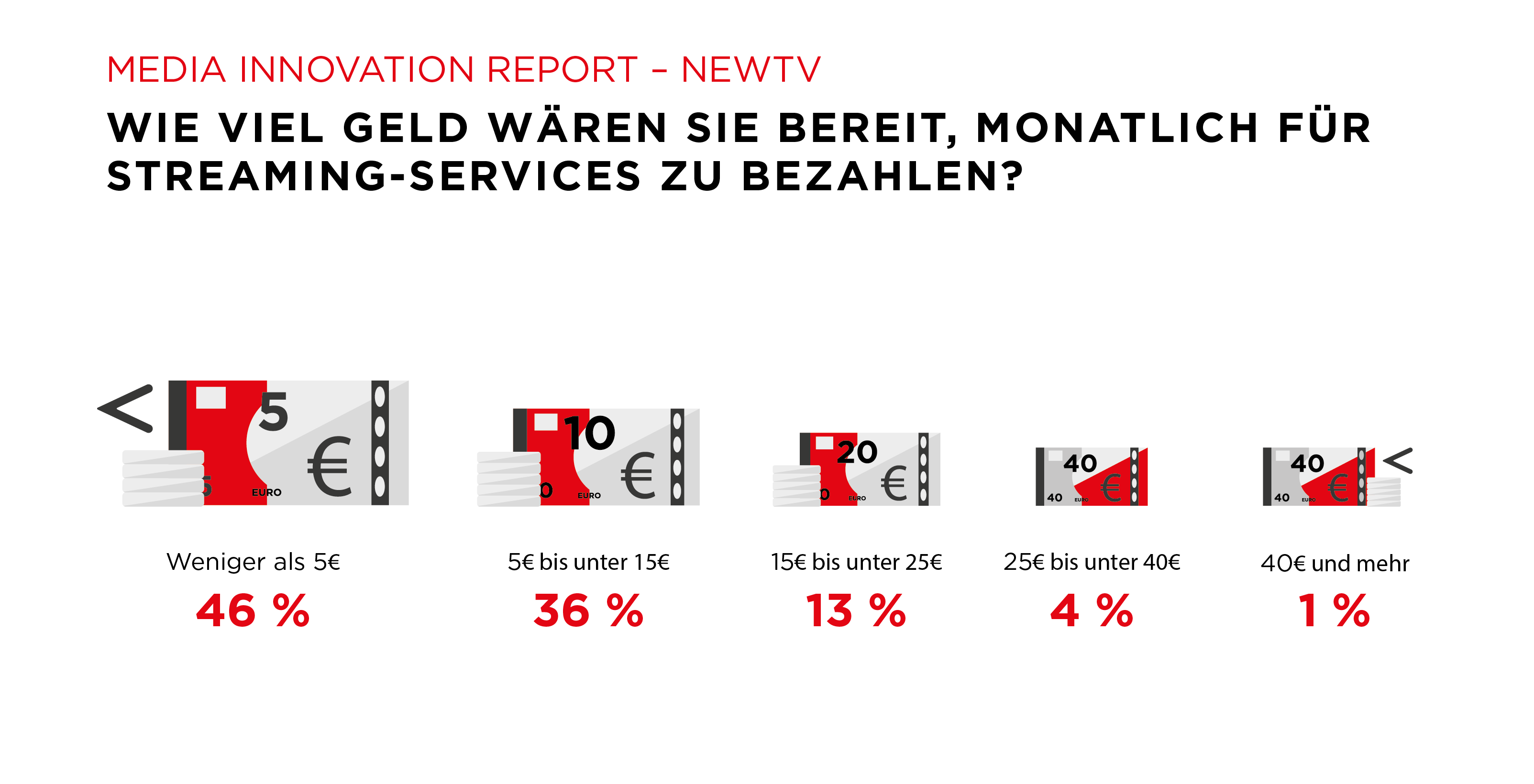 Für den Media Innovation Report gaben 46 Prozent der Befragten an, monatlich nicht mehr als fünf Euro für Streaming-Services ausgeben zu wollen. Immerhin 36 Prozent sind bereit, bis zu 15 Euro fürs Streaming zu berappen. Bis zu 25 Euro findet nur noch bei 13 Prozent der Befragten Zustimmung. Lediglich vier Prozent wären bereit bis zu 40 Euro zu zahlen.