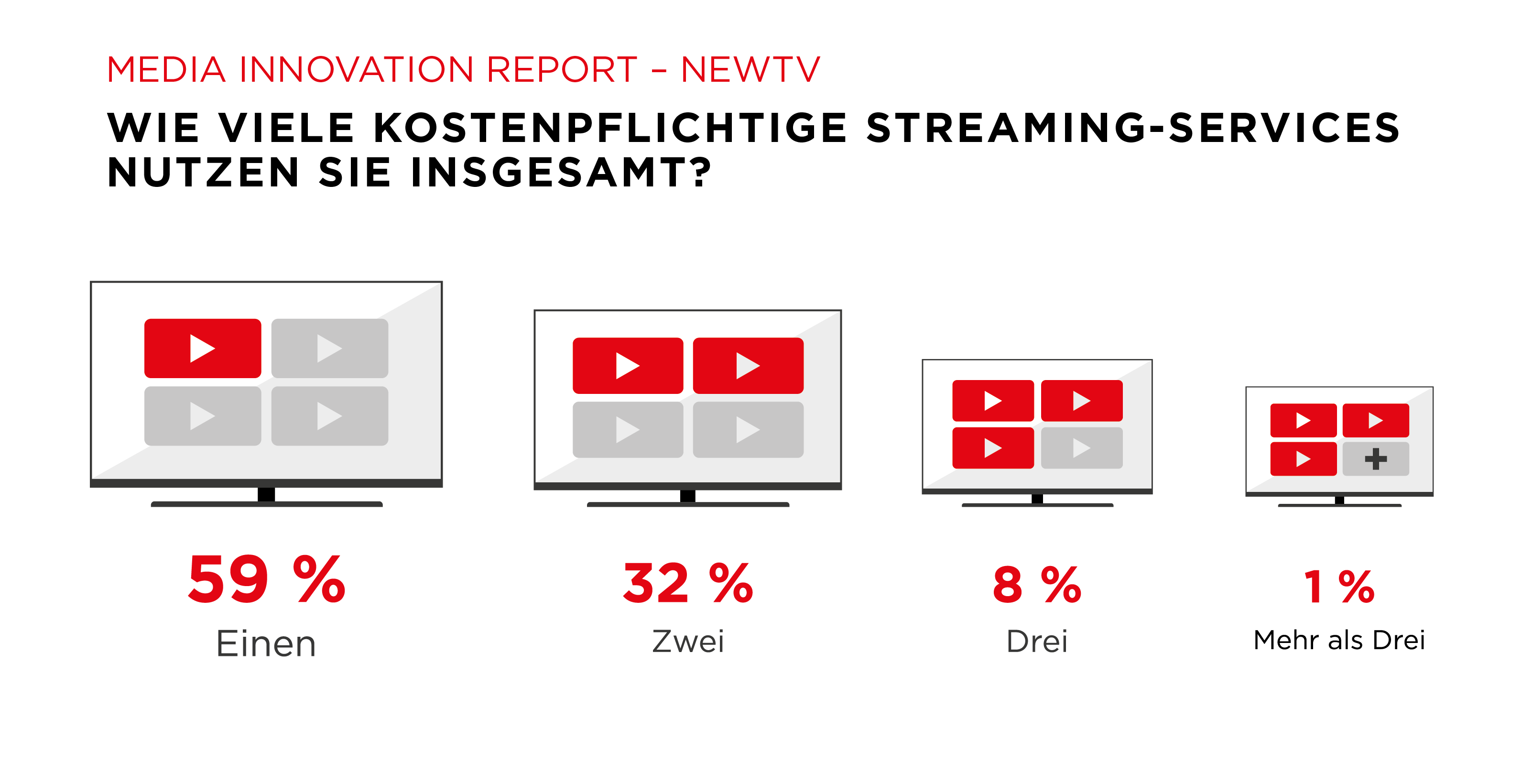 In der Bewegtbildstudie gaben 59 Prozent der Befragten an, nur einen einzigen kostenpflichtigen Dienst zu nutzen. 32 Prozent nutzen zwei Streaming-Services. Nur acht Prozent können sich für drei Dienste erwärmen.