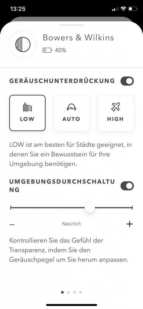 Der Unterschied zwischen „Low“ und „High“ ist deutlich hörbar. Die höchste Stufe dämpft sonore Hintergrundgeräusche im Straßenverkehr am besten. Allerdings ist sie anfälliger für Windböen und verstärkt diese sogar auf unangenehme Weise. In Gebäuden spielt das natürlich keine Rolle. Am Büroarbeitsplatz erweist sich die ANC-Funktion des Bowers & Wilkins PX7 im Test daher als hochwirksam.