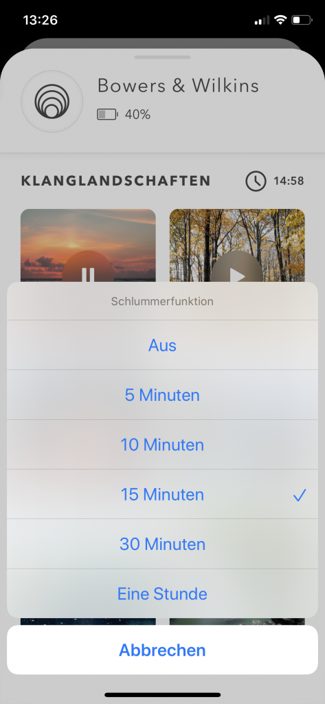 Die App ergänzt die Bedienung am Kopfhörer. Statt nur zwischen den ANC-Stufen zu wechseln, kann ich in der App auch den Lautstärkepegel der Außengeräusche im Transparenzmodus variieren. Wer Entspannung sucht, findet in der Anwendung sechs „Klanglandschaften“, die in Endlosschleife Naturgeräusche wiedergeben. Ein Timer stoppt die Schlummersounds nach einer selbst gewählten Dauer.