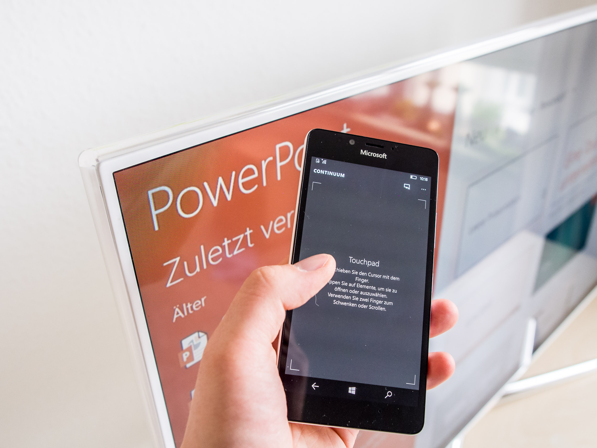 Dieses Verfahren ist zwar für Einzelplatz-Arbeitsnomaden gedacht, die ihr Smartphone somit vielerorts flexibel zum PC aufwerten können, aber auch bei Präsentationen vor Gruppen ist das recht praktisch. Statt einen Laptop zu bedienen, hält der Referent nur ein kompaktes Smartphone in der Hand. Das Display des Lumia dient dabei als Trackpad mit Mauszeiger und Software-Tastatur. Weil Continuum wie eine normale App funktioniert, kann man parallel zur Bildschirmpräsentation bereits andere Inhalte für das Streaming suchen und starten.