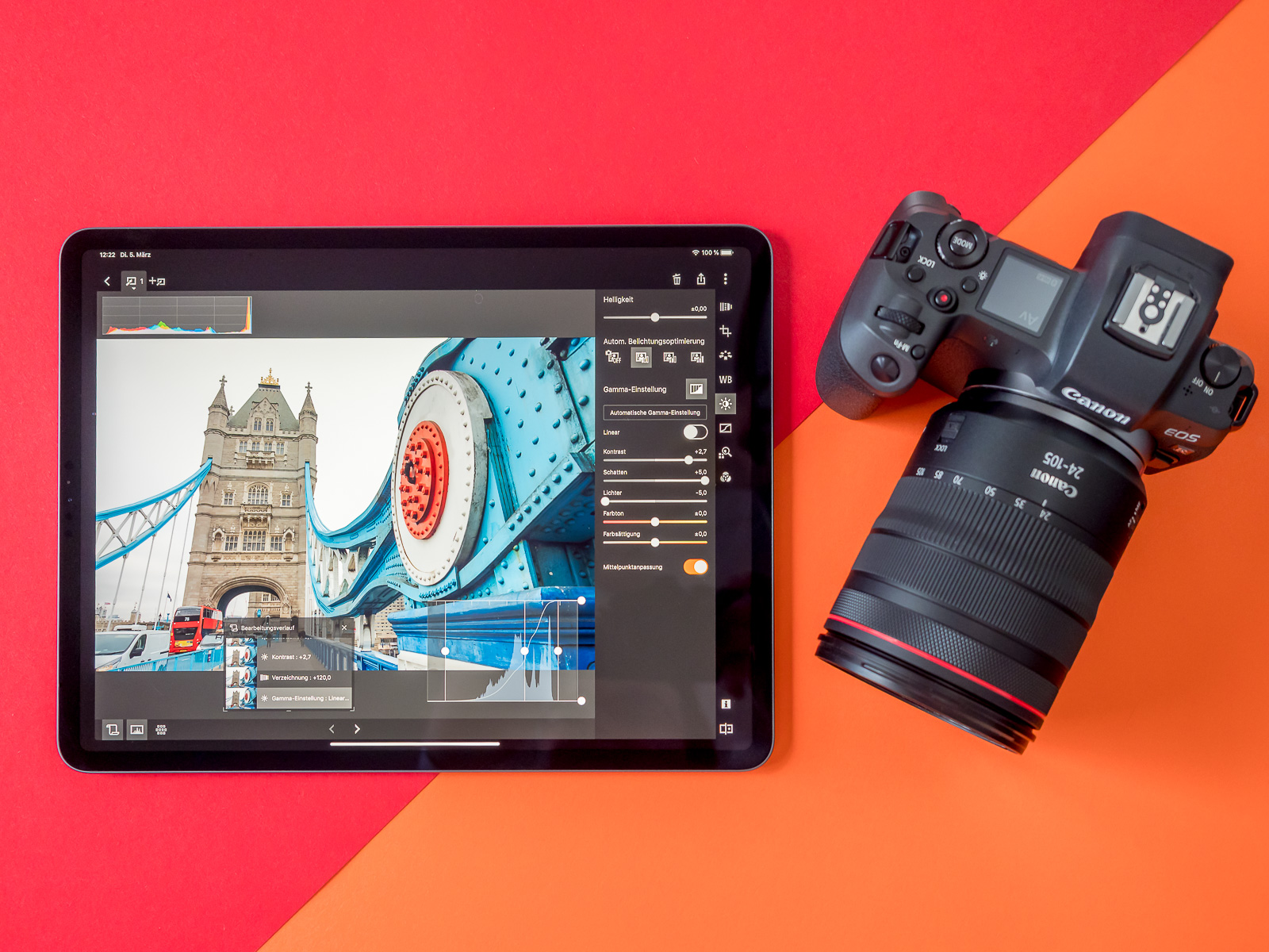 Das aus unserer Sicht beste Setup für den Transfer ist, Canon Camera Connect und DPP Express auf dem iPad im „verknüpften Modus“ zu verwenden und dann mit der EOS R zu verwenden. Dann werden die etwa 60 MB großen CR3-Dateien direkt in DPP Express importiert und gehen keinen Umweg über Apple Fotos.