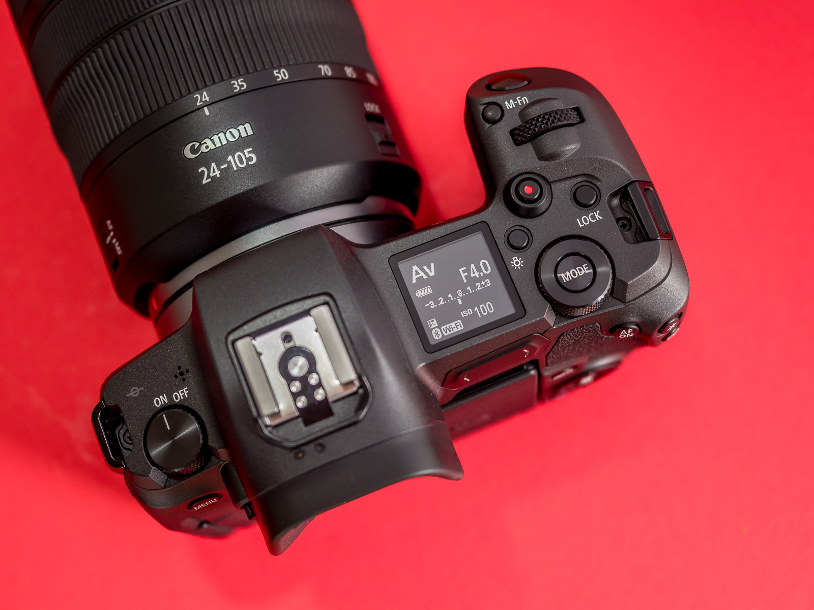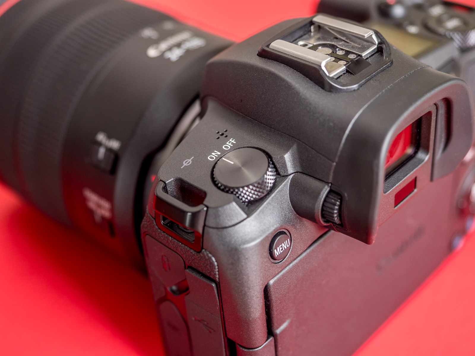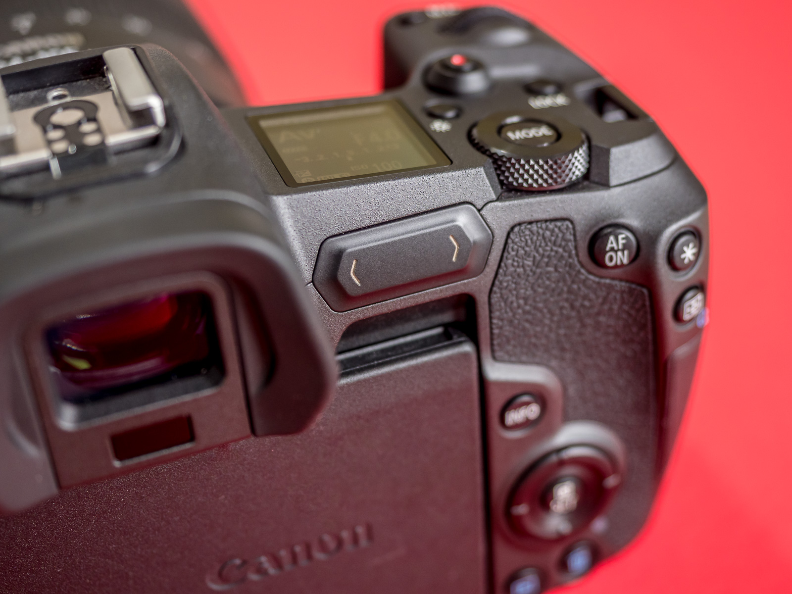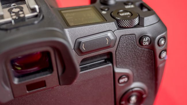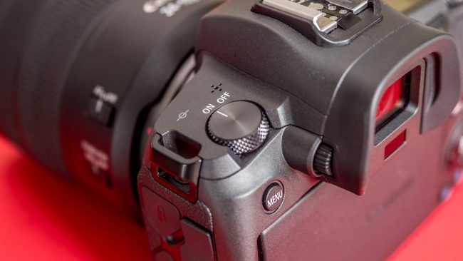 Nicht nur beim Gewicht speckt Canon gegenüber seinen traditionellen DSLR ab, auch in Sachen Steuerung trennt sich der Hersteller von Bewährtem. Mit neuartigen Bedienelementen und ungewöhnlicher Platzierung geht er neue Wege. Das fängt schon mit dem Verzicht auf ein separates Rad für den Betriebsmodus an. Denn den wertvollen Platz links neben dem Sucherbuckel belegt Canon lieber mit einem großen An-/Aus-Schalter. Stattdessen rufen wir den Betriebsmodus über einen Knopf auf, der im hinteren Rändelrad versenkt ist.