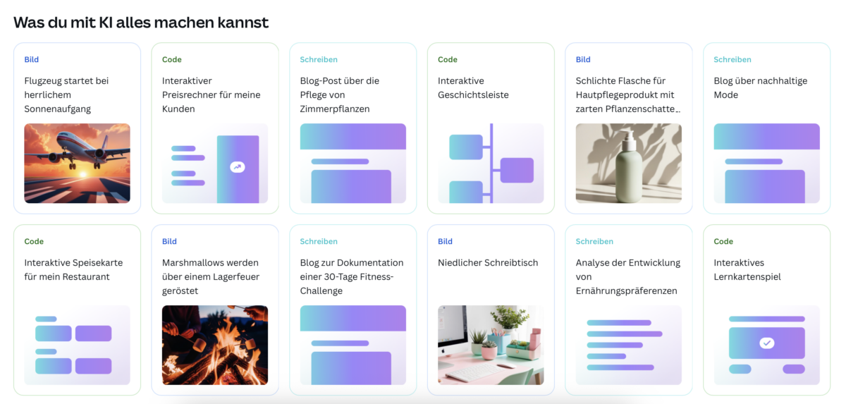 Magic Design: Hier genügt ein kurzer Textprompt oder ein Bild, und Canva schlägt automatisch Designvorschläge vor – passend zum Inhalt, Format und gewünschten Stil. Das spart enorm viel Zeit beim Einstieg in neue Projekte.