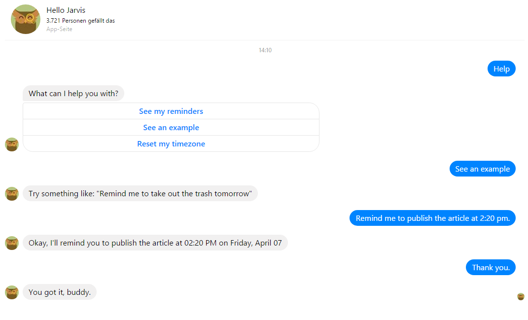 Wollt ihr erinnert werden, sagt ihr also beispielsweise (auf Englisch bitte, wenn ihr mit dem Bot schreibt): „Erinnere mich um 14:20 Uhr daran, den Artikel zu veröffentlichen“. Und ihr werdet zu diesem Zeitpunkt eine Nachricht mit der Erinnerung erhalten. Das funktioniert einwandfrei. Der Kommunikationsstil ist angenehm informell und enthalt neben Umgangssprache auch Emojis. Ihr findet den Bot unter @helloimjarvis.
