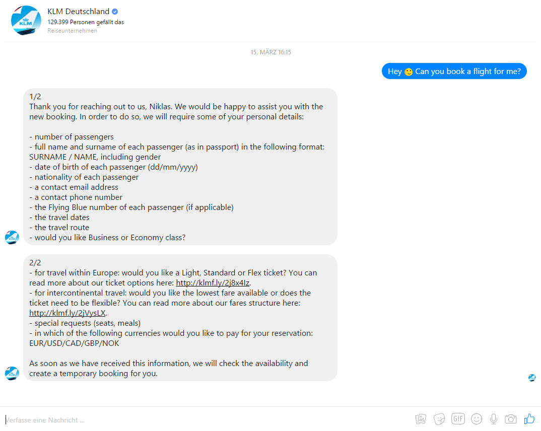 Ich verdeutliche es euch an einem Beispiel: Ihr möchtet beispielsweise einen Flug mit der niederländischen Fluggesellschaft KLM buchen. Das könnt ihr inzwischen über den Facebook Messenger erledigen. Alles, was ihr dafür tun müsst, ist „KLM“ oder @KLM.Deutschland in der Suchmaske des Facebook Messenger einzugeben. Dieser Link führt euch auch dahin. Dann schreibt ihr KLM eine Nachricht. Ein schlichtes „Hallo“ genügt. Kurz darauf erhaltet ihr eine automatisch generierte Antwort (siehe Screenshot).