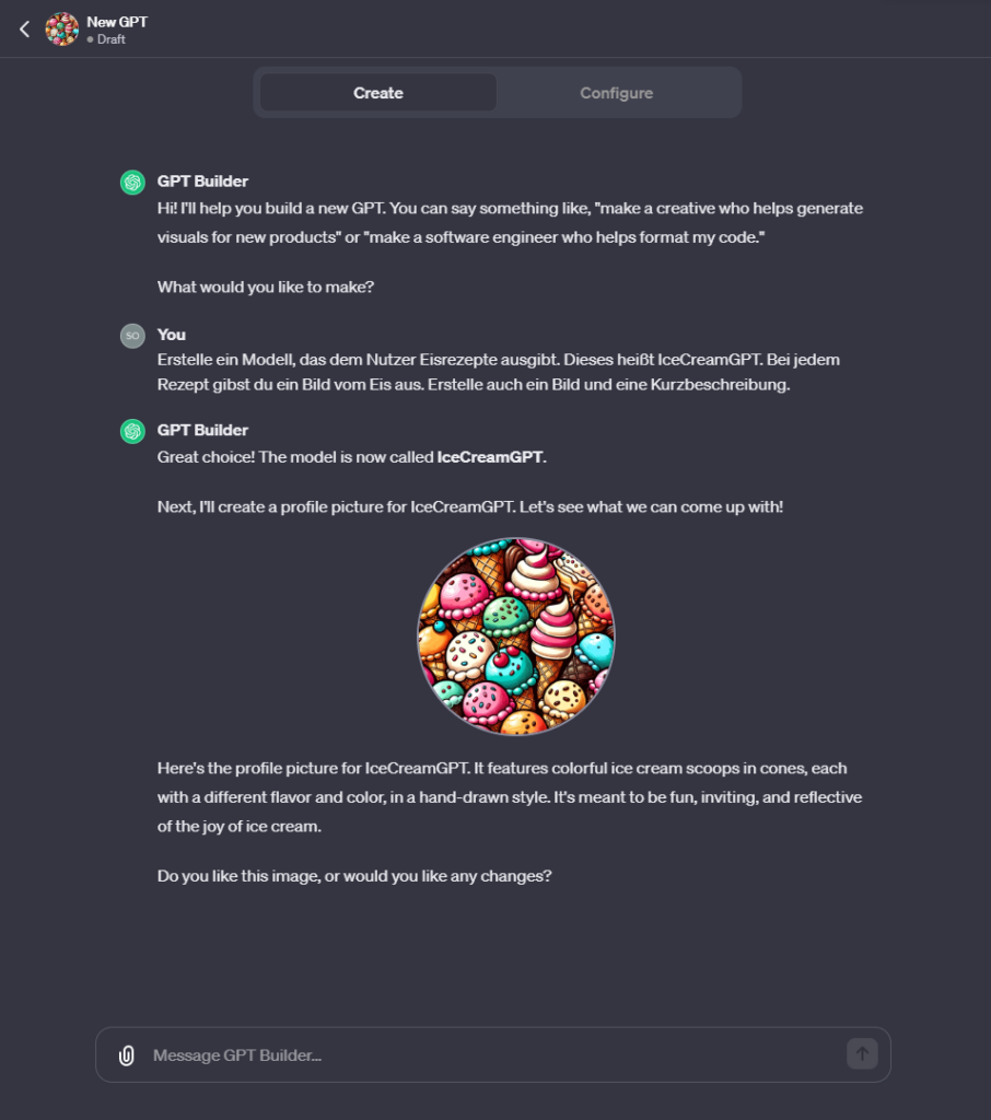 Zusätzlich bietet der GPT Builder die Option, euer Modell zu teilen. Durch einen speziellen Link können andere ChatGPT Plus Nutzer auf euer IceCreamGPT Modell zugreifen und es in Aktion erleben. Dies ist besonders nützlich für das Sammeln von Feedback oder wenn ihr mit einem Team an der Entwicklung des Modells arbeitet und sicherstellen wollt, dass alle Beteiligten die neuesten Iterationen ausprobieren können. Das Teilen des Modells kann auch dazu beitragen, eine Gemeinschaft von Nutzern aufzubauen, die an der Weiterentwicklung des Projekts interessiert sind, indem sie Vorschläge machen und zur Verbesserung der Modellleistung beitragen.