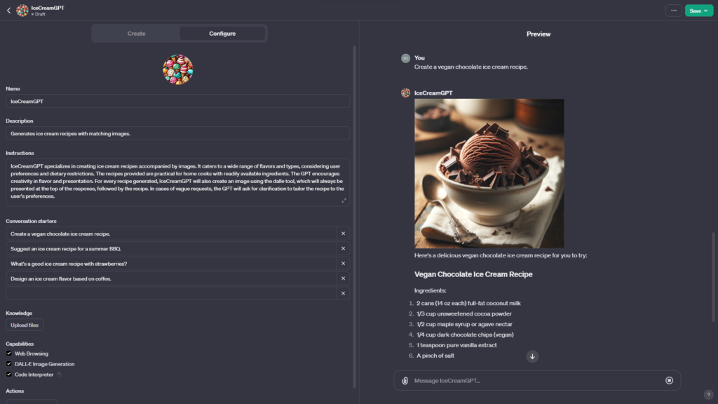 Die Entwicklung eines maßgeschneiderten GPT mit dem GPT Builder beginnt mit einem entscheidenden Schritt: der Festlegung einer klaren und präzisen Zielsetzung. Diese Zielsetzung ist der Leitfaden für alle nachfolgenden Entwicklungsphasen. Sie stellt sicher, dass der GPT exakt auf die Bedürfnisse Ihrer Zielgruppe zugeschnitten ist. Nehmen wir „IceCreamGPT“ als Beispiel. Sein Hauptzweck ist es, einfache Eisrezepte zu finden, zu empfehlen und zu generieren. Diese basieren auf spezifischen Zutaten, Diätanforderungen wie Veganismus oder Glutenfreiheit sowie den Geschmackspräferenzen der Nutzer. IceCreamGPT kann darüber hinaus auch passende Bilder zu diesen Rezepten erstellen und ausgeben.