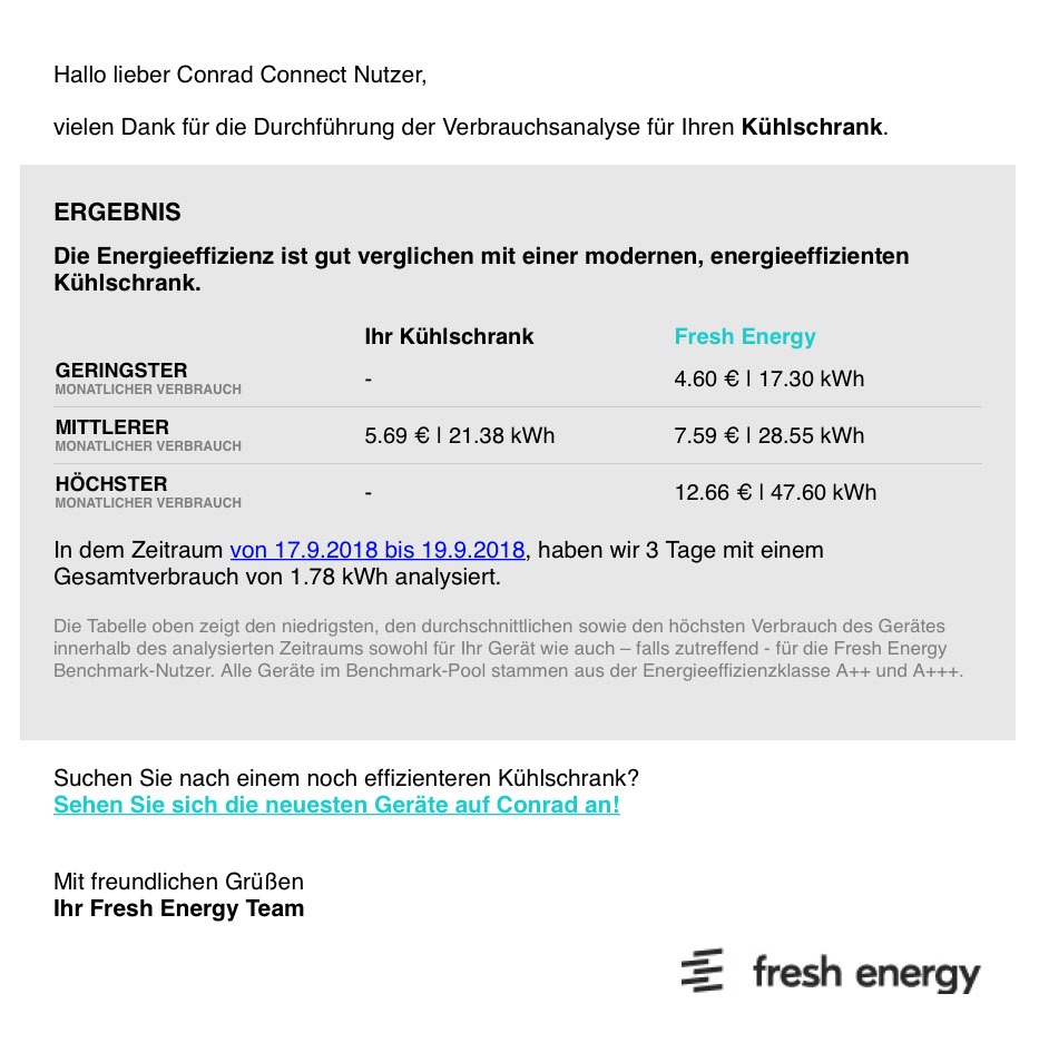 Als Analysedauer für die Strommessung haben wir drei Tage angegeben. Davon ausgehend hat Fresh Energy den Verbrauch auf einen Monat hochgerechnet und mit dem Durchschnitt verglichen. Das Ergebnis: Unser Liebherr-Mittelklassemodell aus 2010 schneidet im Vergleich „gut“ ab. Wünschten wir uns mehr Energieeffizienz liefert die E-Mail gleich einen Link zum Online-Shop von Conrad.