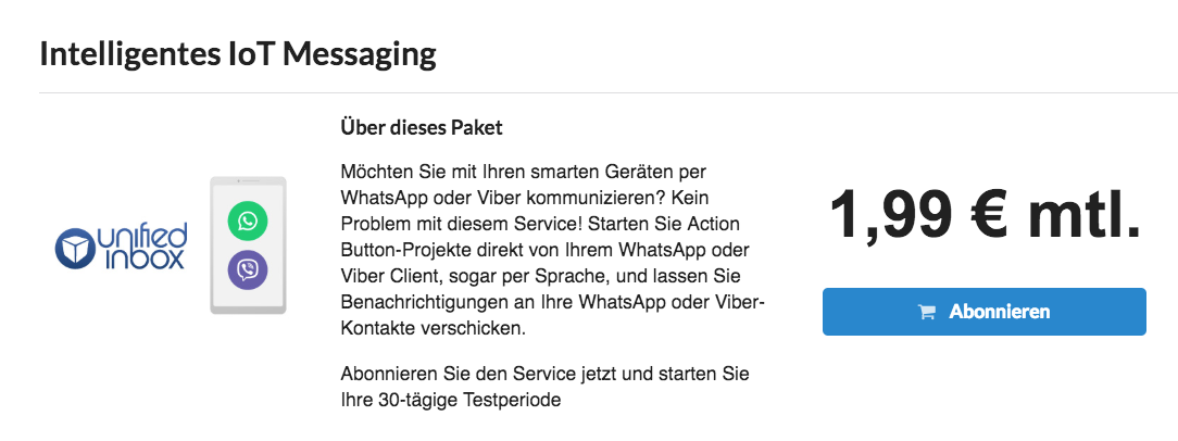 Ein weiterer bereits freigeschalteter Dienst auf dem Conrad Connect Service Marketplace stammt vom Anbieter Unified Inbox und dreht sich um Intelligentes Messaging fürs Internet of Things. Wenn Nutzer die entsprechenden Funktionen für 1,99 Euro im Monat abonnieren, können sie ihr Zuhause über die Messaging-Apps WhatsApp und Viber bedienen. Beispielsweise lassen sich dann Smart-Home-Szenarien aus der Ferne per WhatsApp starten. Alternativ informiert das Smart Home via Messaging-Dienst den Nutzer oder seine Kontakte über ein bestimmtes Ereignis.
