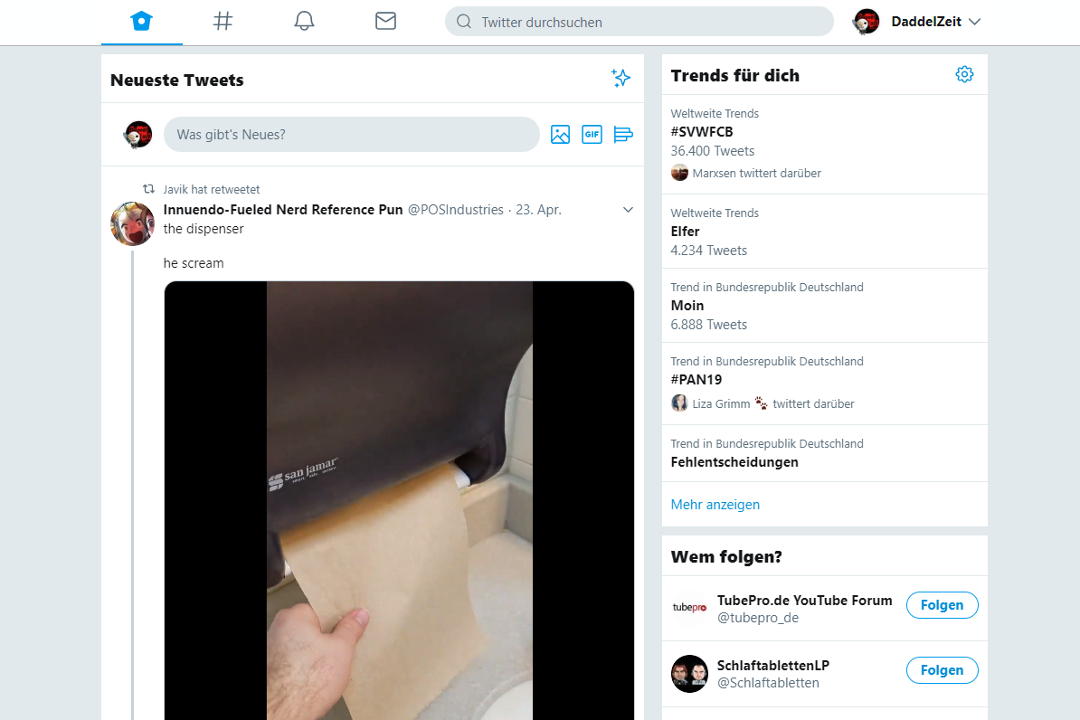 Eine weitere Änderung, die stark ins Auge fällt, ist das schlankere Design. Statt drei Spalten beschränkt sich das Design auf nur noch zwei. Die linke Spalte des alten Designs fällt weg. Die Kurzübersicht des eigenen Accounts wurde gestrichen und die Trends sind auf die rechte Seite über die „Wem folgen?“-Empfehlungen gewandert.