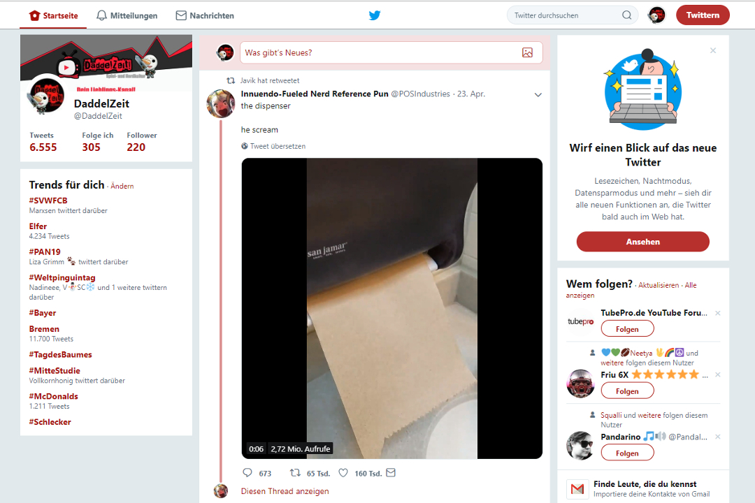 Als ich kürzlich auf Twitter ging, dachte ich zuerst, irgendetwas verstellt zu haben. Die Trends waren auf der anderen Seite und den oberen Rand zierte nun zusätzlich ein Hashtag-Symbol. Ich habe Google nach Neuigkeiten zu Twitter befragt: Nichts. Ich habe auf Twitter geschaut, ob irgendein Hashtag dazu trendet: Nichts. Das neue Design wird derzeit nämlich erst Stück für Stück ausgerollt und ich war einer der Glücklichen, die es nun zu Gesicht bekommen haben. Warum nicht nutzen, um meine Eindrücke mit der Allgemeinheit zu teilen? Außerdem könnt ihr das neue Design auch problemlos selbst ausprobieren.