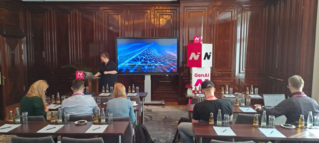 Wir hatten das Glück dass Manoj Keshavaprakash von Mbition (Mercedes-Benz Innovation Lab) in diesem Workshop saß und verdeutlichte, wie unterschiedlich die Anforderungen an eine sprachbasierte KI sein können, da die Umstände in einem fahrenden Auto weitaus komplizierter sind als ein Chat auf einer Kundensupport-Webseite. Nicolle Merrill stimmte mit ihm überein, dass ein Hybridmodell am sinnvollsten ist, um den verschiedenen Situationen gerecht zu werden. Auch ihr war die Bedeutung der menschlichen Instanz in Zusammenarbeit mit KI bewusst. Um sie zu zitieren „They give u the feeling your 80 percent there, when in fact you 90 percent away“. Dies bezog sie auf das generieren von Codes durch KIs. Wenn es um das Design eines Chatbots geht, sind laut ihr vier Stationen essenziell „Acceptable actions“ (was darf der Bot tun) „Unacceptable actions“( was darf er nicht tun) Thresholds of uncertanty (was sind die Felder der Unsicherheit) Vulnerabilities( welche Schwächen hat unser Bot).