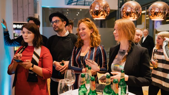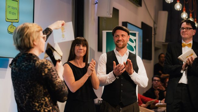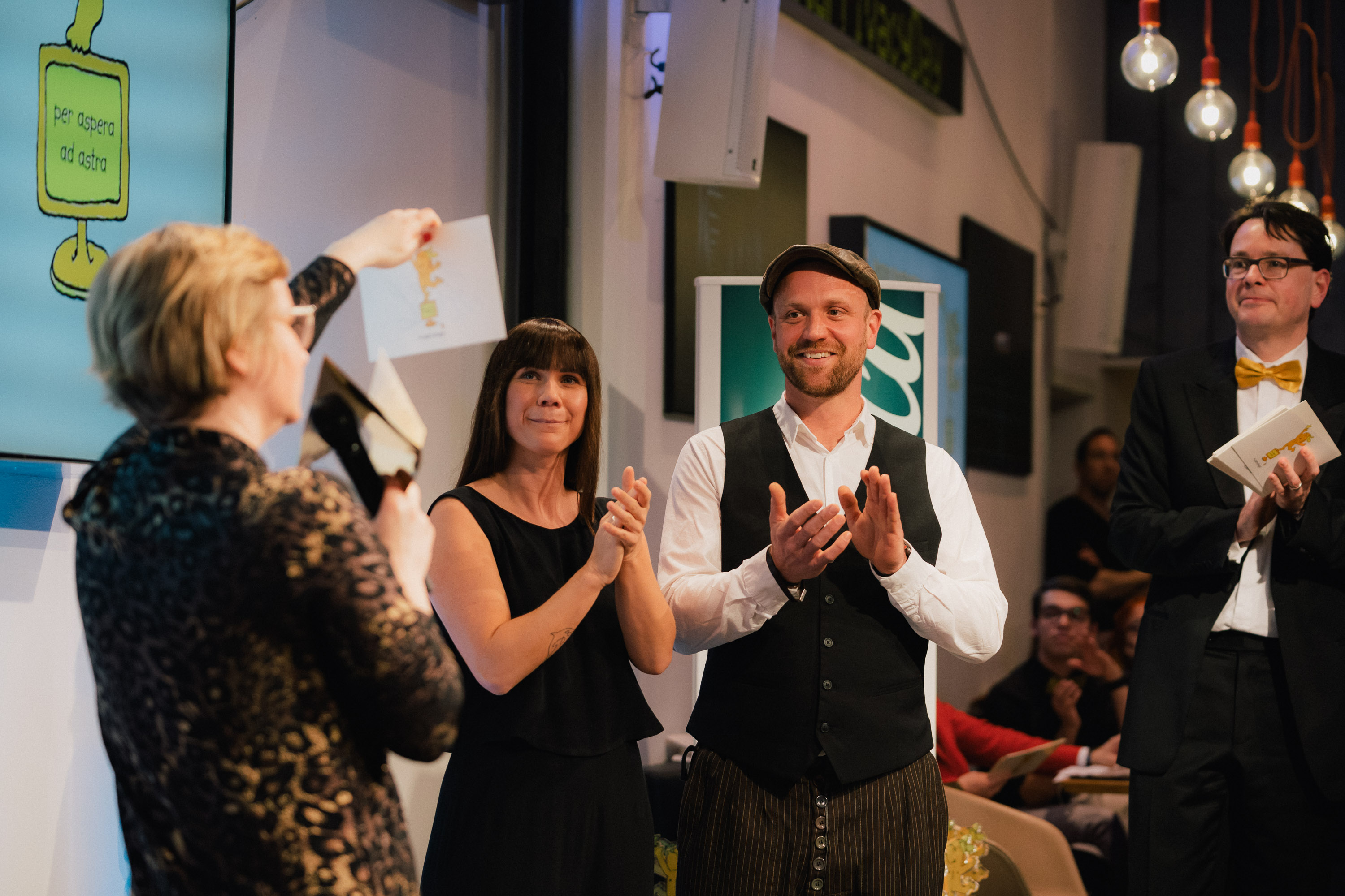 Der Reihe nach wurden die Nominierten auf das Podest geholt und kurz, aber herzlich von Thomas Knüwer vorgestellt. Ulkige Momente gab es da, etwa als sich die für den besten Twitter-Account nominierten Sophie Passmann und Welt-Journalist Robin Alexander schlagfertig zankten, der erfahrene Gabor Steingart (Jahrgang 1962) seine Nominierung in der Kategorie Bester Newcomer mit „Ist doch Hammer!“ kommentierte oder Vanessa Giese von Fräulein Nessy trocken konstatierte, dass Handball ja wohl schon immer cool gewesen sei. Für Begeisterung sorgte bei vielen außerdem die thematische Vielfalt der Blogs. Jennifer Kosche, die mit kunecoco letztes Jahr die DIY-Kategorie gewann, nannte Truck Online (genau, der Blog eines Truckerfahrers über das Truckfahren) ihren Favoriten des Abends. Juramama Nina Katrin Straßner (Juristin, Mutter, Bloggerin) erhielt unter großem Beifall den Preis für den besten Text des Jahres 2018, in dem sie ihrem Ärger über den bestehenden § 219a StGB Luft macht.