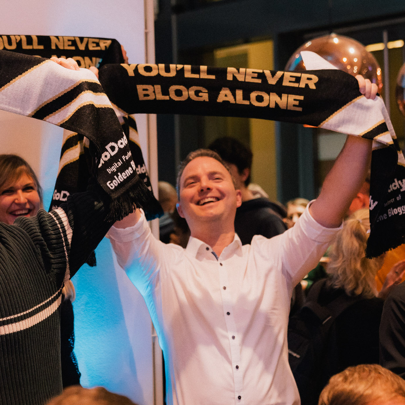 Die veränderte Wahrnehmung im Sinne von wertschätzender Akzeptanz gegenüber Blogger*innen und sogar Respekt attestiert auch Nina Katrin Straßner von juramama. „Es wird deutlich ernster genommen. Viele Blogs sind ja Nischenblogs, die die Leute indirekt erreichen, sodass tatsächlich Wirtschaft und Politik oder wer auch immer bestimmte Programme an den Mann oder die Frau bringen muss, dahin gucken müssen. Wenn ein Blogger mit einem etwas bekannteren Blog etwas verreißt, dann ist das Politik.“, so Straßner. Zu politisch wurde es an dem Abend aber schönerweise nicht. Nach Vergabe aller Preise endete der offizielle Teil des Abends mit einer textlich variierten Performance des Songs You’ll never walk alone. Gemäß dem schon erwähnten Sponsorenmotto sang man You’ll never blog alone und schwang im Kollektiv die Schals durch die Schwüle. Toll wars!