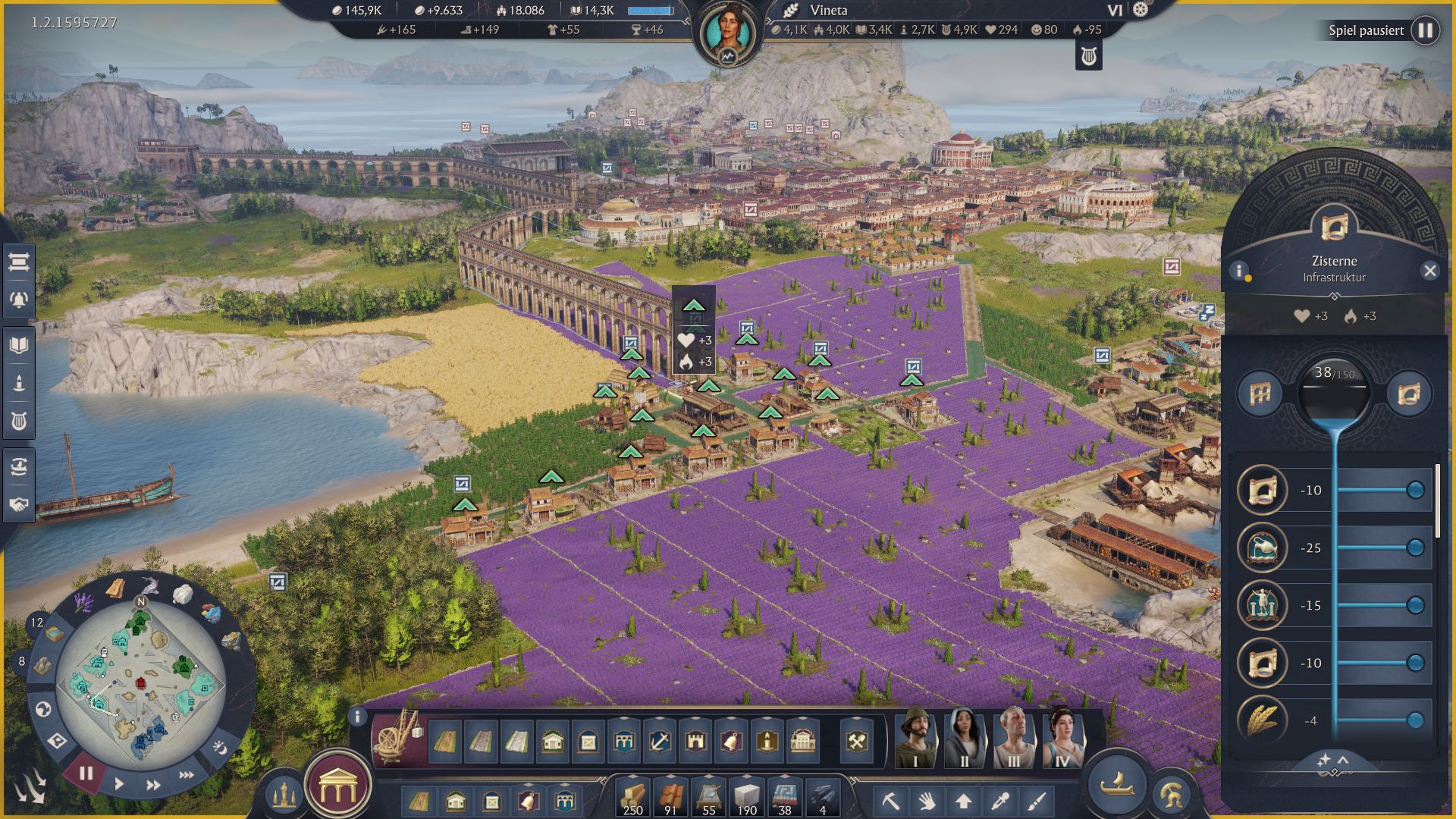 Die Wasserversorgung der Römer war damals schon unglaublich fortgeschritten. Mittels Aquädukten brachten sie Wasser über kilometerlange Brückenkonstruktionen aus Bergen in Regionen, die weniger gut mit Süßwasser versorgt waren. Auch im Spiel werten die imposanten Konstruktionen nicht nur das Stadtbild auf, sondern sind ein massiver Boost für jede Insel. Der Effekt, aber auch der Aufwand ist dabei nicht ganz so groß, wie die Elektrizität im Vorgänger.