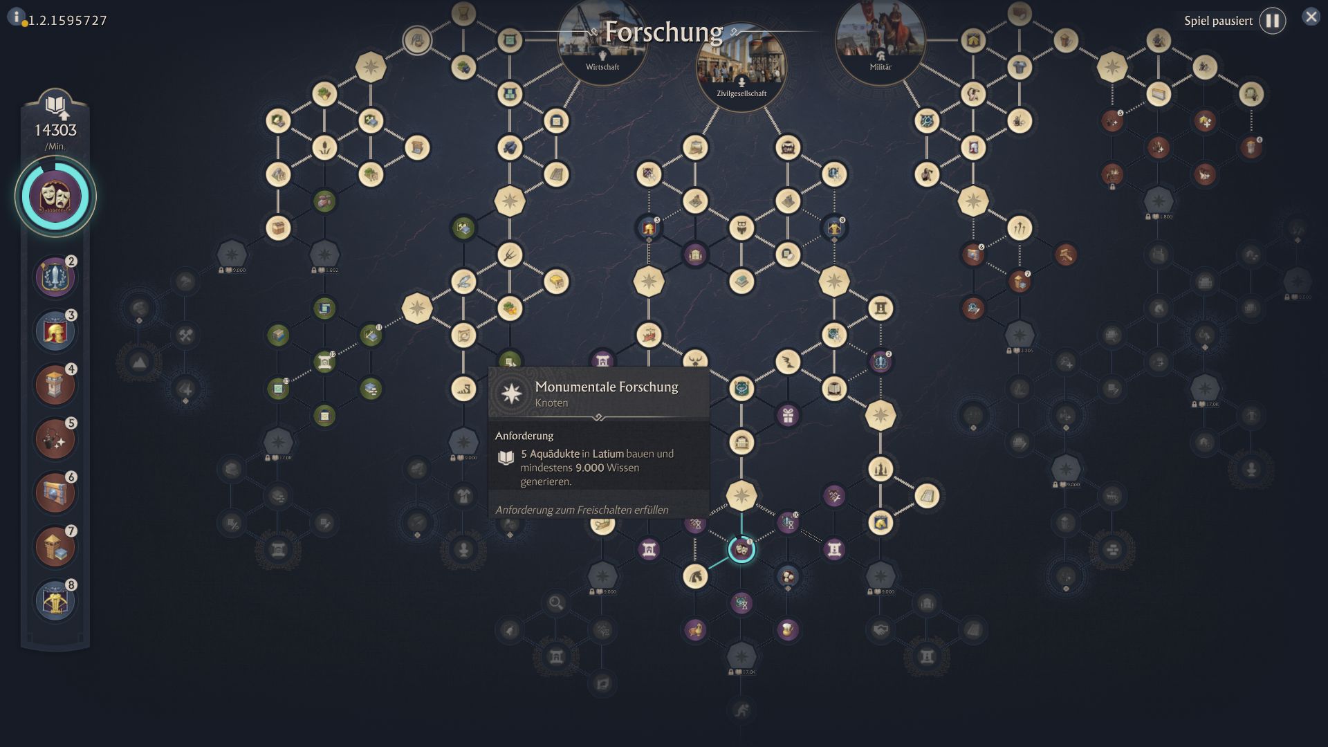 Der Forschungsbaum ist in 3 Zweige unterteilt: Wirtschaft, Zivil und Militär. Tatsächlich gibt es aber auch in Zivil-Zweig Entdeckungen, die euren Militärgebäuden zusätzliche soziale Boni verschaffen. Ihr könnt nicht zu Beginn gleich frei jede Technologie auswählen, sondern müsst euch vorige Technologien des Baumes erforschen. spätere Unterzweige schaltet ihr zudem ab bestimmten Meilensteinen frei. Zu diesen gehört neben den Wissenspunkten aller Inseln meist auch eine weitere Bedingung. So muss man für einen Unterzweig der sich auf Albion konzentriert dort Handelsrouten etabliert haben, um ihn freizuschalten.
