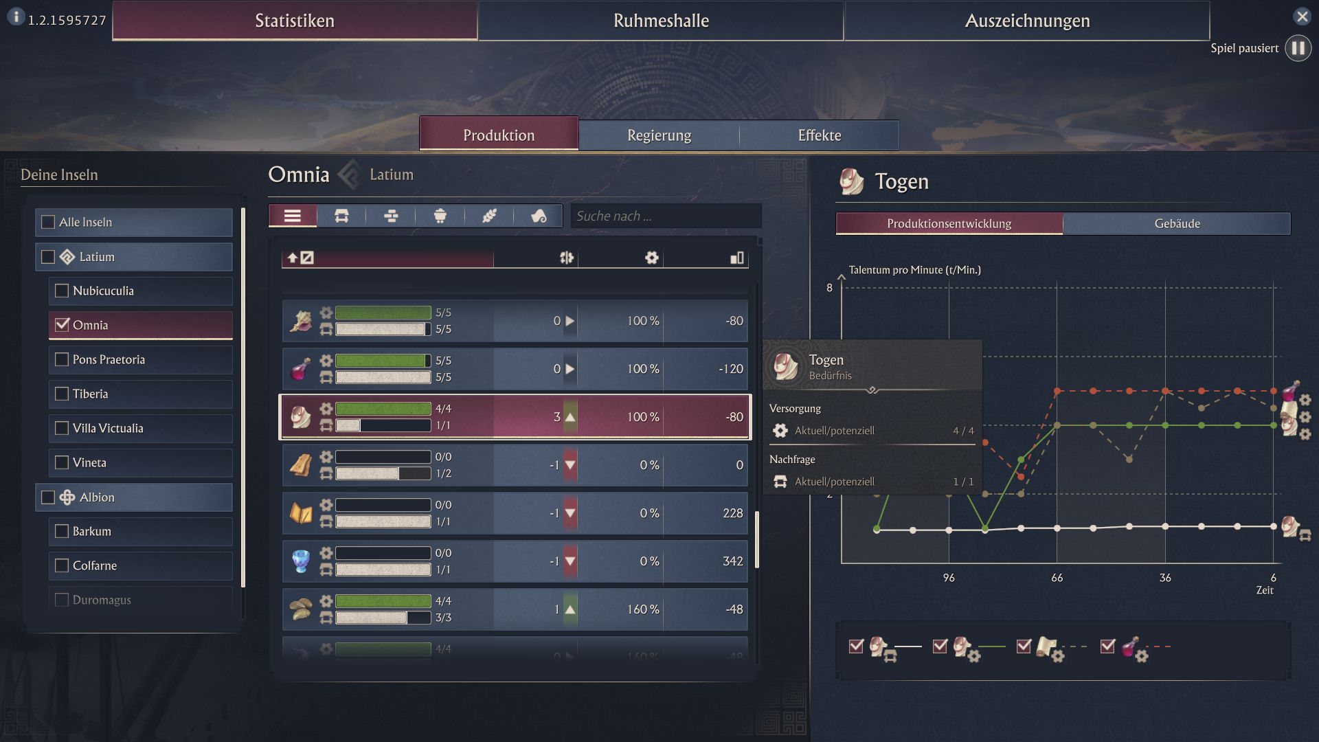 So lassen sich Produktionsketten auch ohne vorigen ausrechnen der nötigen Gebäude optimieren. Baut ihr neue Gebäude im pausierten Spiel, müsst ihr die Pause erst beenden, damit die Produktionsübersicht auch die neuen Gebäude einbezieht.
