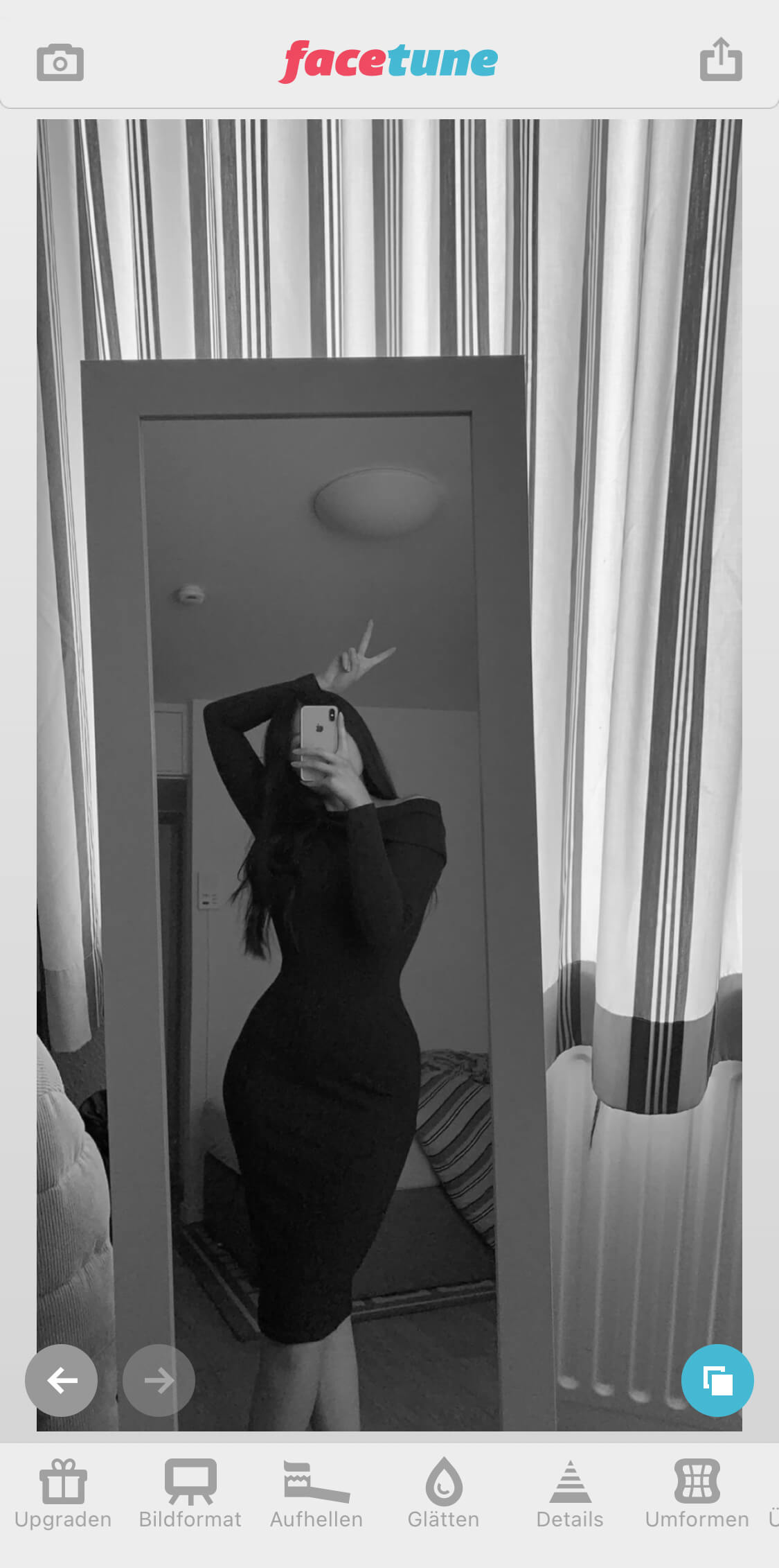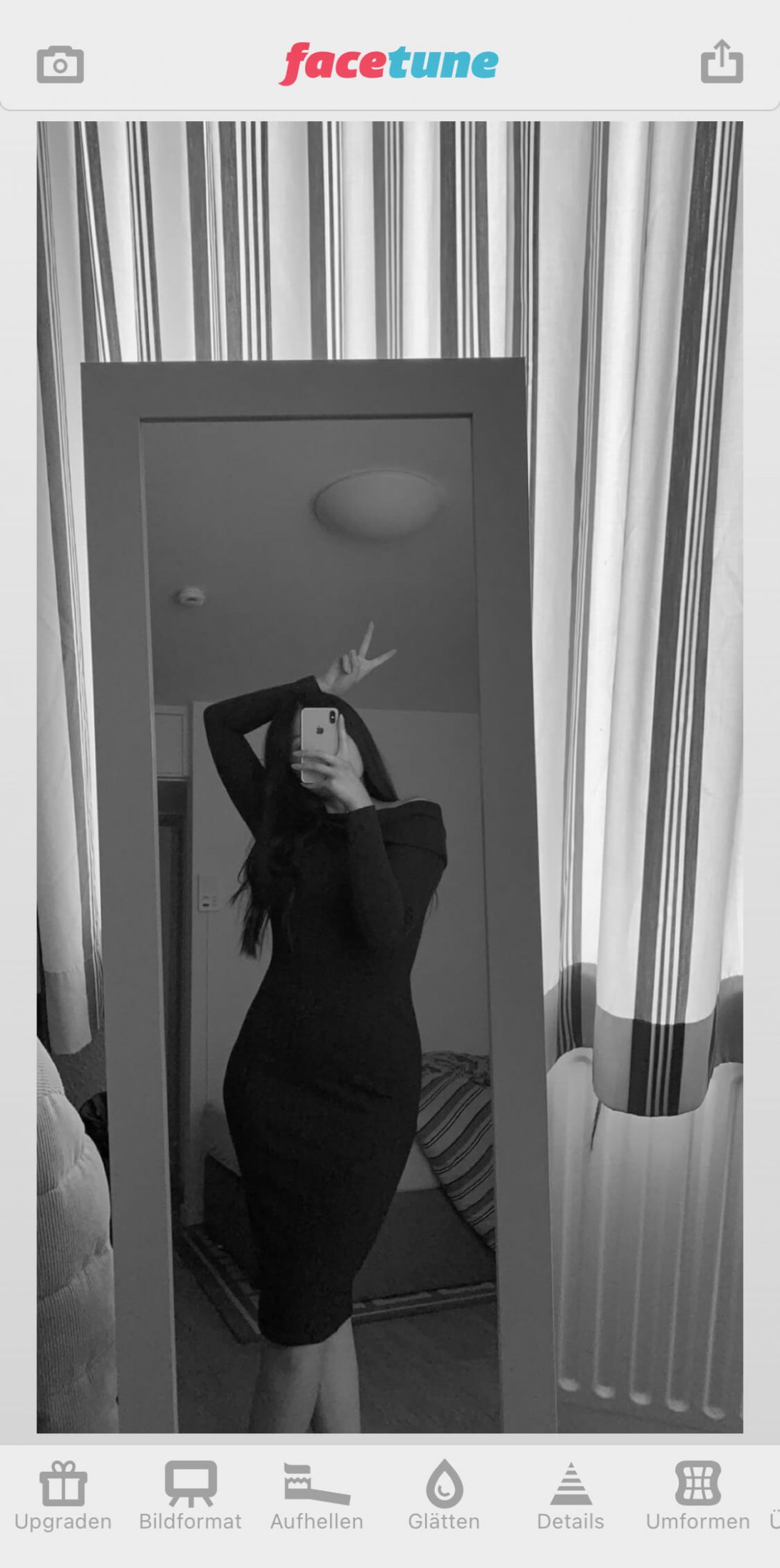 Hier seht ihr zwei Fotos von mir, die ich jeweils mit besagten Tools bearbeitet habe. Zum einen habe ich bei dem Selfie die Haut geglättet und bin mit dem Detail-Tool über Augen und Augenbrauen gegangen. Zum anderen habe ich das Weiß in meinen Augen aufgehellt. Bei dem Mirror-Selfie habe ich das Umformen-Tool genutzt und sehr offensichtlich meine Taille geschmälert: