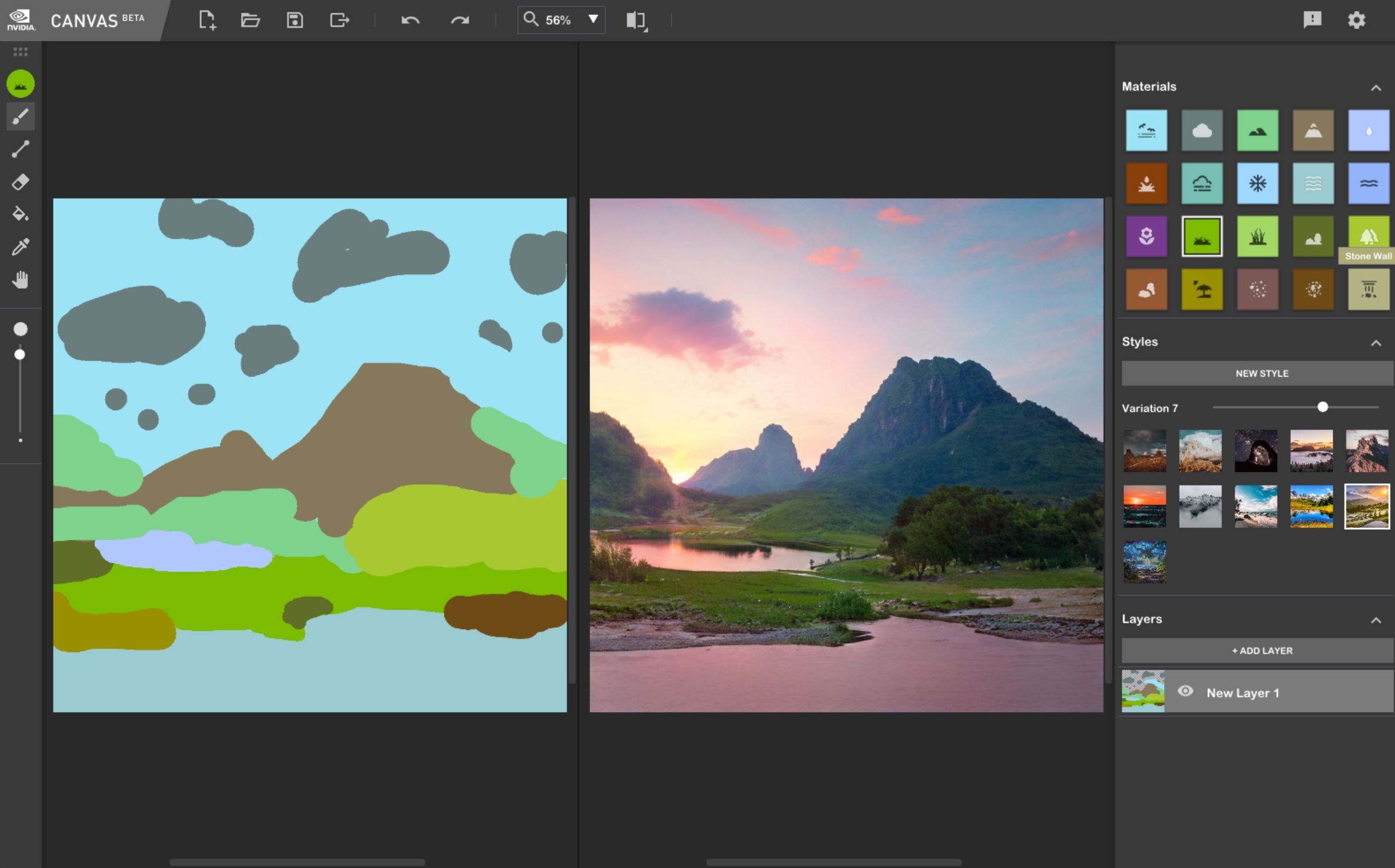 Canvas AI lässt euch mit einer begrenzten Auswahl Farben auf einer Leinwand malen. Jede Farbe steht dabei für einen Landschafts-Typ. Ihr bestimmt wo Wiesen, Berge oder Wasser im Bild sein soll und Canvas AI erzeugt daraus ein photorealistisches Bild.