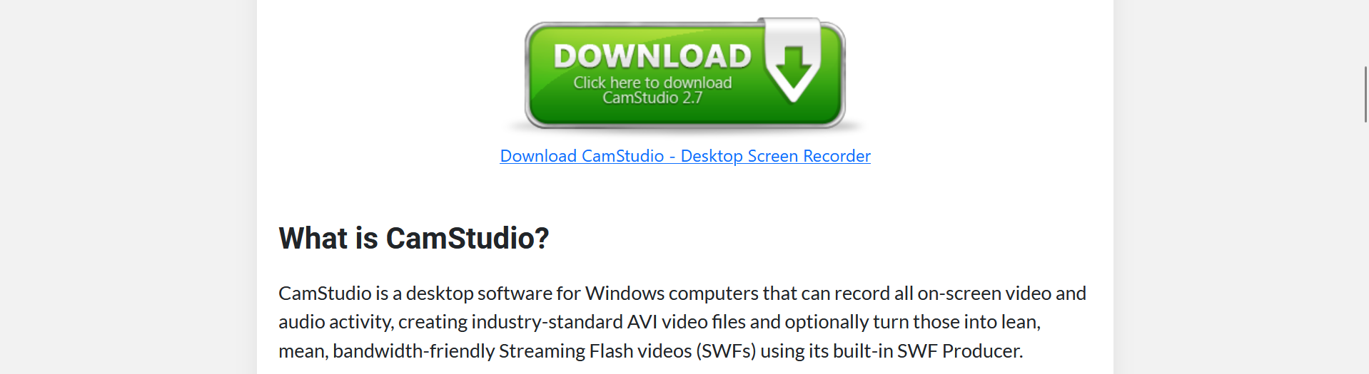 Der CamStudio Bildschirm Recorder unterstützt die kompatiblen Formate AVI und SWF, die das Teilen von Videos erleichtern. Er zeichnet Bildschirmaktionen und Audio auf und ist damit ideal für Bildschirmlektionen, Software-Demos und Komplettlösungen. Es verfügt nicht über umfangreiche Bearbeitungsfunktionen, daher müssen Benutzer für die Nachbearbeitung eine