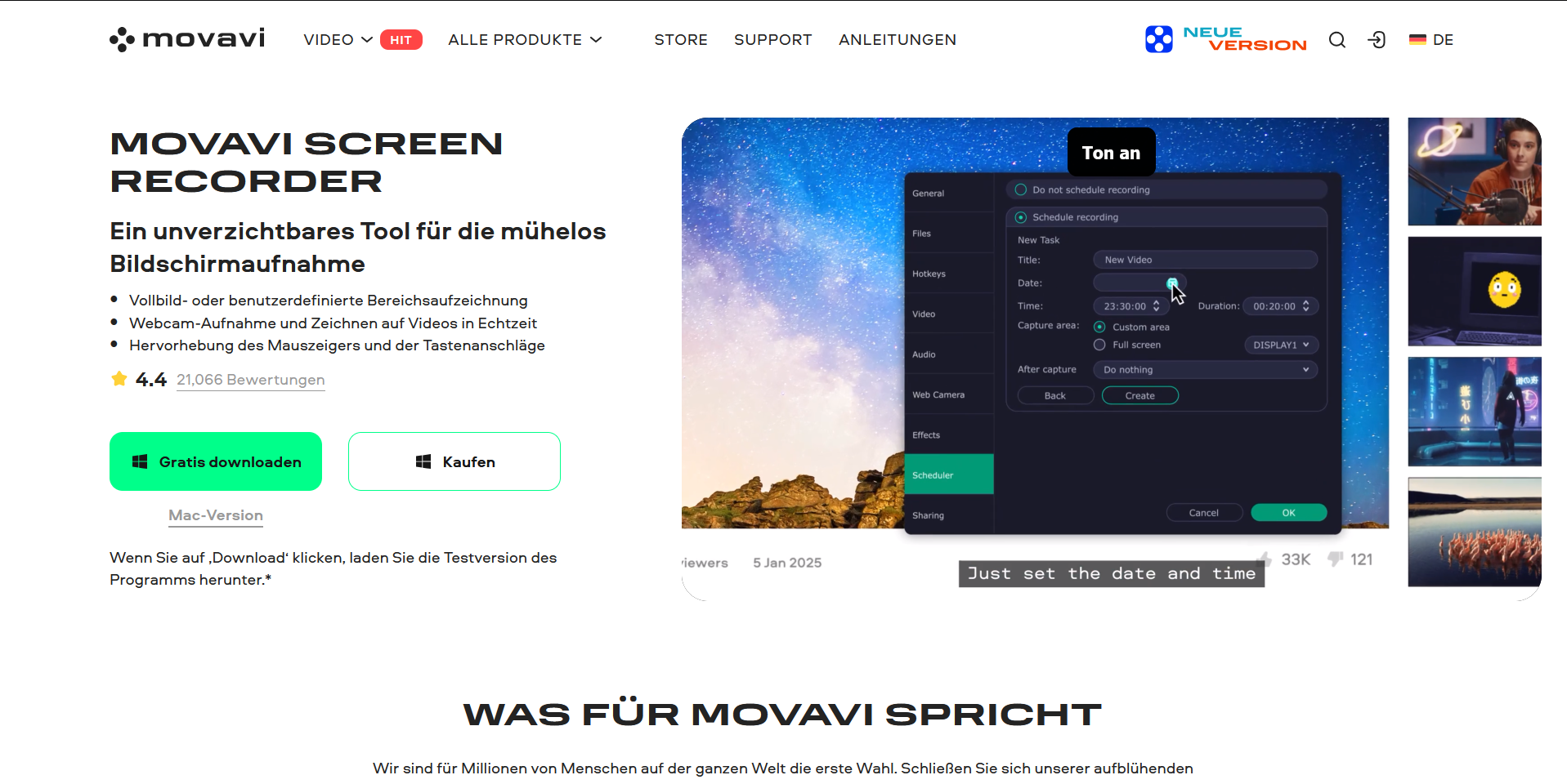 Movavi Screen Recorder ist eine flexible Screen Recording Software für Anfänger und Experten. Dank seiner einfachen Benutzeroberfläche erleichtert Movavi die Bildschirmaufnahme durch eine schrittweise Anleitung von der Einrichtung bis zum Export. Durch die Vollbild- und anpassbare Bereichsaufzeichnung kann der Benutzer auswählen, was er auf dem Bildschirm Aufnahme möchte. Movavi kann Systemaudio, Mikrofoneingang und Webcam-Overlays aufnehmen und eignet sich daher hervorragend für Videoschulungen, Produktdemos und Anrufe.