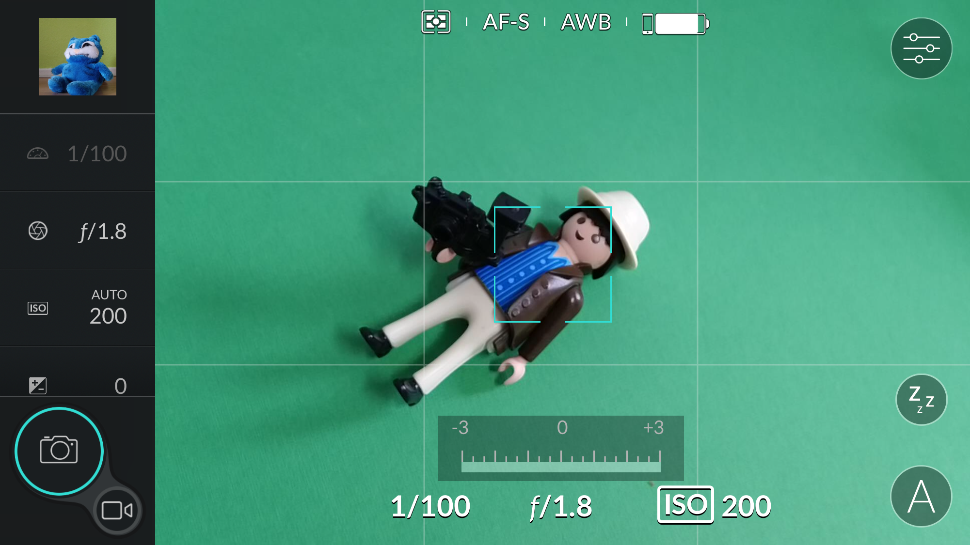 In der hervorragend durchdachten DxO-App in der Version 2.1 finde ich mich schnell zurecht. Ihr Layout ist fürs Querformat gestaltet. Auf der linken Seite der Live-Bildvorschau wechsele ich zwischen Foto- und Video-Modus. Zudem verändere ich dort Blende, Verschlusszeit, ISO, Belichtungskorrektur, Belichtungsmessung und Weißabgleich. Auf der rechten Seite entscheide ich mich mit dem Button unten für P, A, S, M oder einen szenenbezogenen Aufnahmemodus.