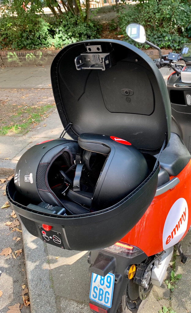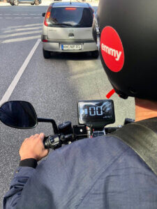 Auf die Frage: „Bist Du Hans oder Mohammed?“ bekommen wir natürlich keine Antwort, aber zum Glück ist das auch nicht wirklich nötig, denn wir buchen einfach das Modell mit dem besseren Batteriestand und bei der Aktivierung meldet sich der Roller per lautem Biepen. In der Topbox (der Koffer auf dem Gepäckträger) finden wir zwei Helme. Diese sind in der Regel in verschiedenen Größen ausgelegt (eben ein größerer und ein kleinerer), so dass meist ein passendes Modell dabei ist, in unserem Fall hat es gut gepasst. Dann kann’s ja losgehen: Helm auf, Roller vom Ständer nehmen (was zum Glück nicht allzu viel Kraft erfordert) und aufgesessen. Den Parkmodus abschalten bzw. den Fahrmodus anschalten und losfahren.