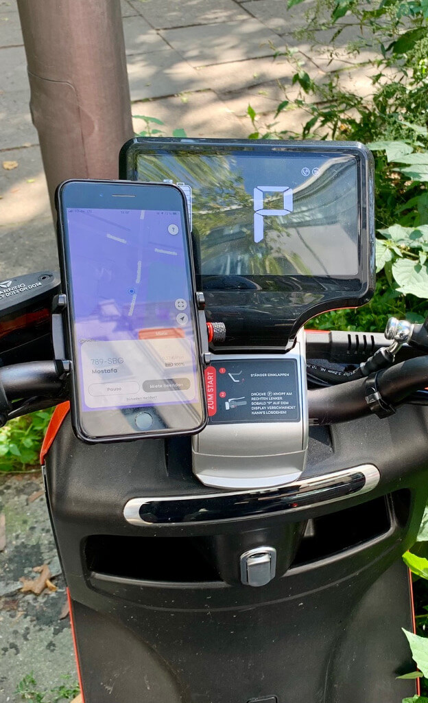 Der Gashebel reagiert mit einer leichten Verzögerung, was einem vorsichtigen Anfahren zuträglich ist. Wir kommen relativ schnell mit dem E-Roller zurecht, und auch das Fahren zu zweit macht keinerlei Probleme. Wer zwar den passenden Führerschein hat, aber selten mit Auto in der Stadt unterwegs ist, muss sich eventuell erstmal an den Verkehr auf mehrspurigen Straßen gewöhnen. Am besten also erstmal eine Runde auf ruhigeren Straßen zur Übung drehen, dann bekommt man schnell Sicherheit im Umgang mit dem Gerät. Auf dem Display des E-Rollers findet sich neben den üblichen Anzeigen für Geschwindigkeit und Blinker etc. auch der Ladestand der beiden Batterien. Apropos Geschwindigkeit: Sobald das Display bei 28 steht, ist Schluss. Der Roller hat also eine Geschwindigkeitsregulierung aktiviert. Aber 28km/h? Das kommt uns dann doch etwas schneller vor und siehe da: es heißt mph für miles per hour – und nicht km/h. Das sollten umgerechnet ca. 45km/h sein. Wer sein Smartphone als Navi nutzen möchte findet übrigens eine einfache und sichere Halterung am Lenker. Aber Vorsicht: denkt daran, dass Ihr das Smartphone noch zum Beenden der Miete benötigt!
