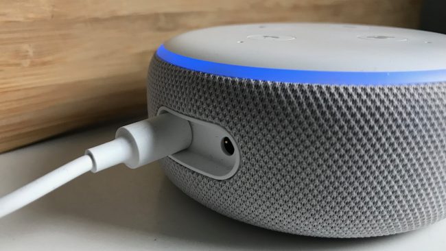 Wie beim Vorgänger verbaut Amazon weiterhin einen Klinkenanschluss, um den Echo Dot mit einer externen Musikanlage zu verbinden. Wer dies allerdings dauerhaft vorhat, sollte jedoch zum ebenfalls neu vorgestellten und günstigeren Echo Input greifen. Der Mikro-USB Anschluss zur Stromversorgung der letzten Generation wurde nur leider gegen einen proprietären Stecker eingetauscht. Schade, dass Amazon hier nicht auf USB-C setzt. Das 1,8 Meter lange Kabel ist fest mit dem Netzstecker verbunden und lässt sich nicht so einfach verlängern.