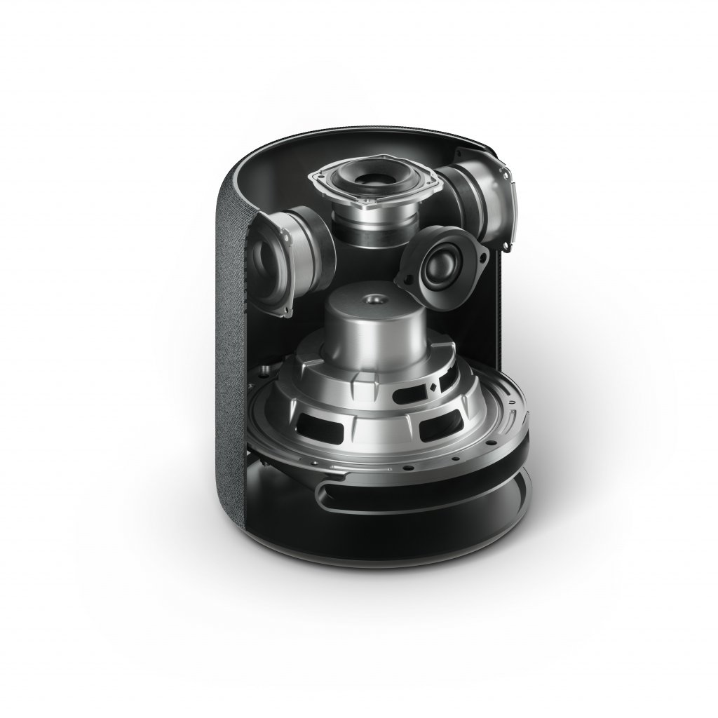 Für diesen Speaker steht klar die Klangqualität im Vordergrund. Der Echo Studio ist mit fünf Lautsprechern ausgestattet. Dabei soll der 5,25 Zoll große Tieftöner mit einer Leistung von 330 Watt für ordentlich Bass und einen kräftigen Klang im Haus sorgen. Dafür hat Amazon den Bassreflexkanal im untern Bereich des Geräts integriert, um somit den Luftstrom und Output zu verbessern. Ebenfalls interessant ist, dass es insgesamt drei 2-Zoll-Mitteltöner gibt, die zu verschiedenen Seiten zeigen. Das unterstützt den 3D-Klang, den der Echo Studio bieten soll. Außerdem ist ein 1-Zoll Hochtöner integriert.